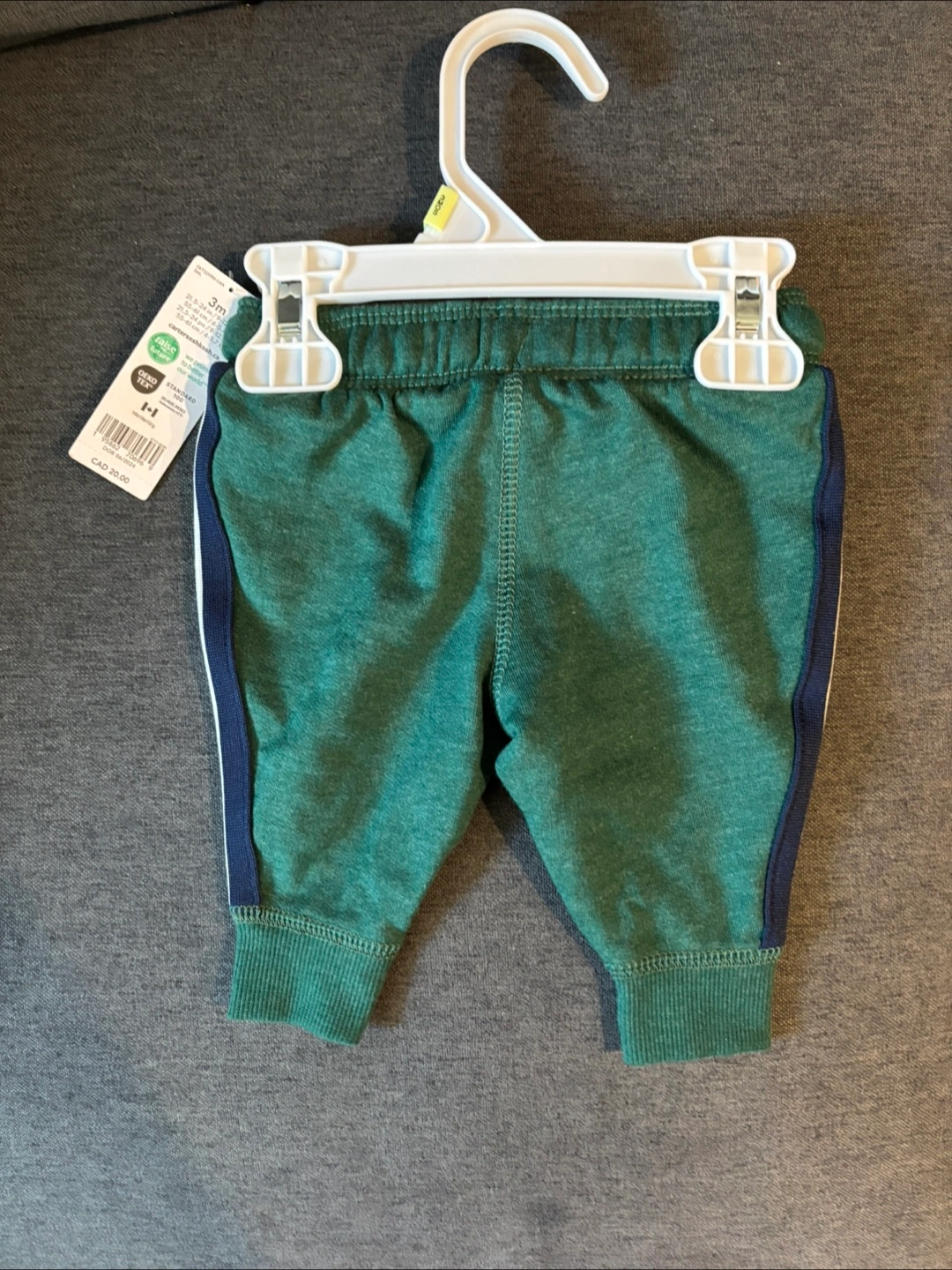 These Carter's baby pants are brand new with tags! They're a cute green colour with a navy and white stripe down the side. Size 3m. Originally CAD $20