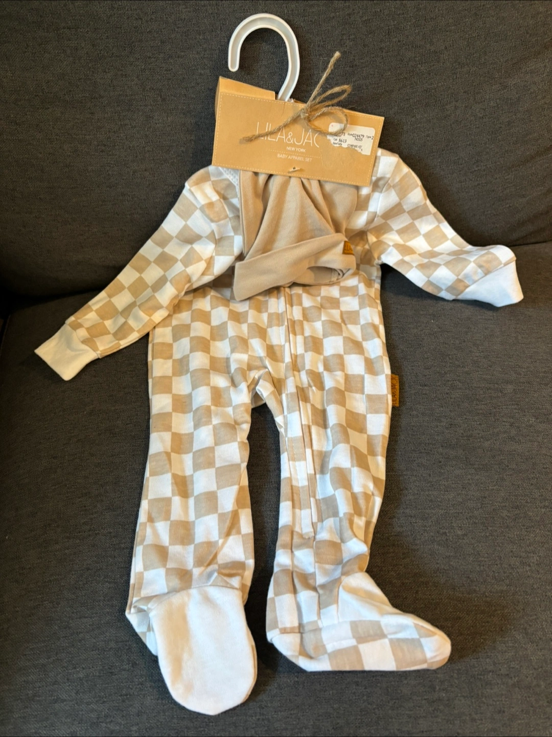I'm selling a brand new Lila & Jack baby apparel set! It features a cute checkered design and comes with a matching hat. Perfect for keeping your little one cozy and stylish.