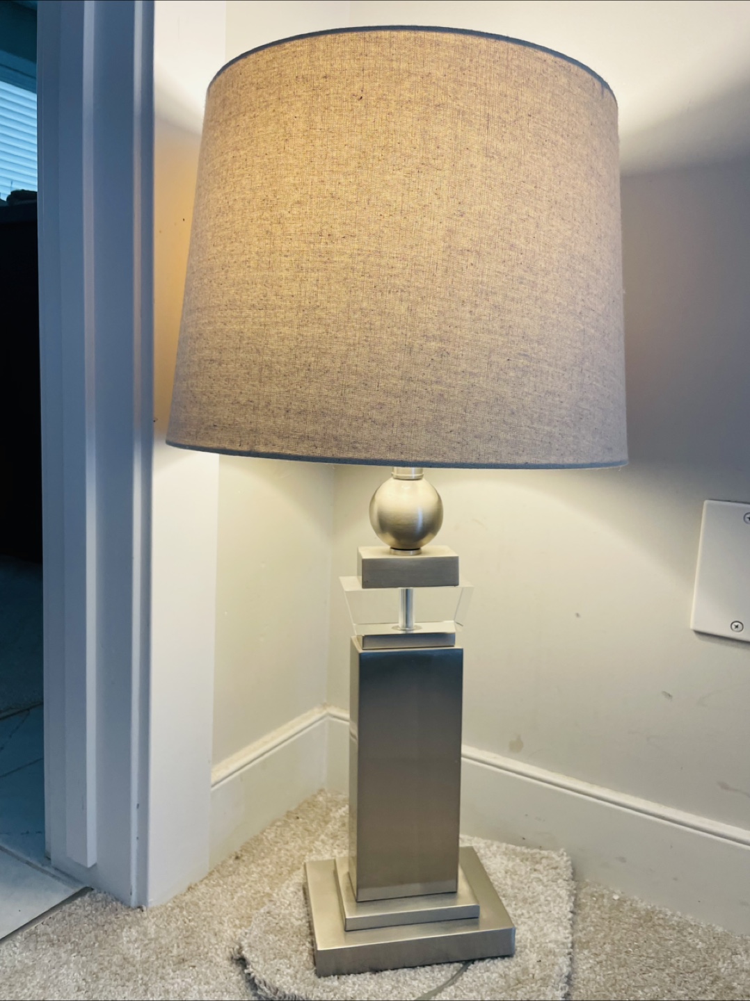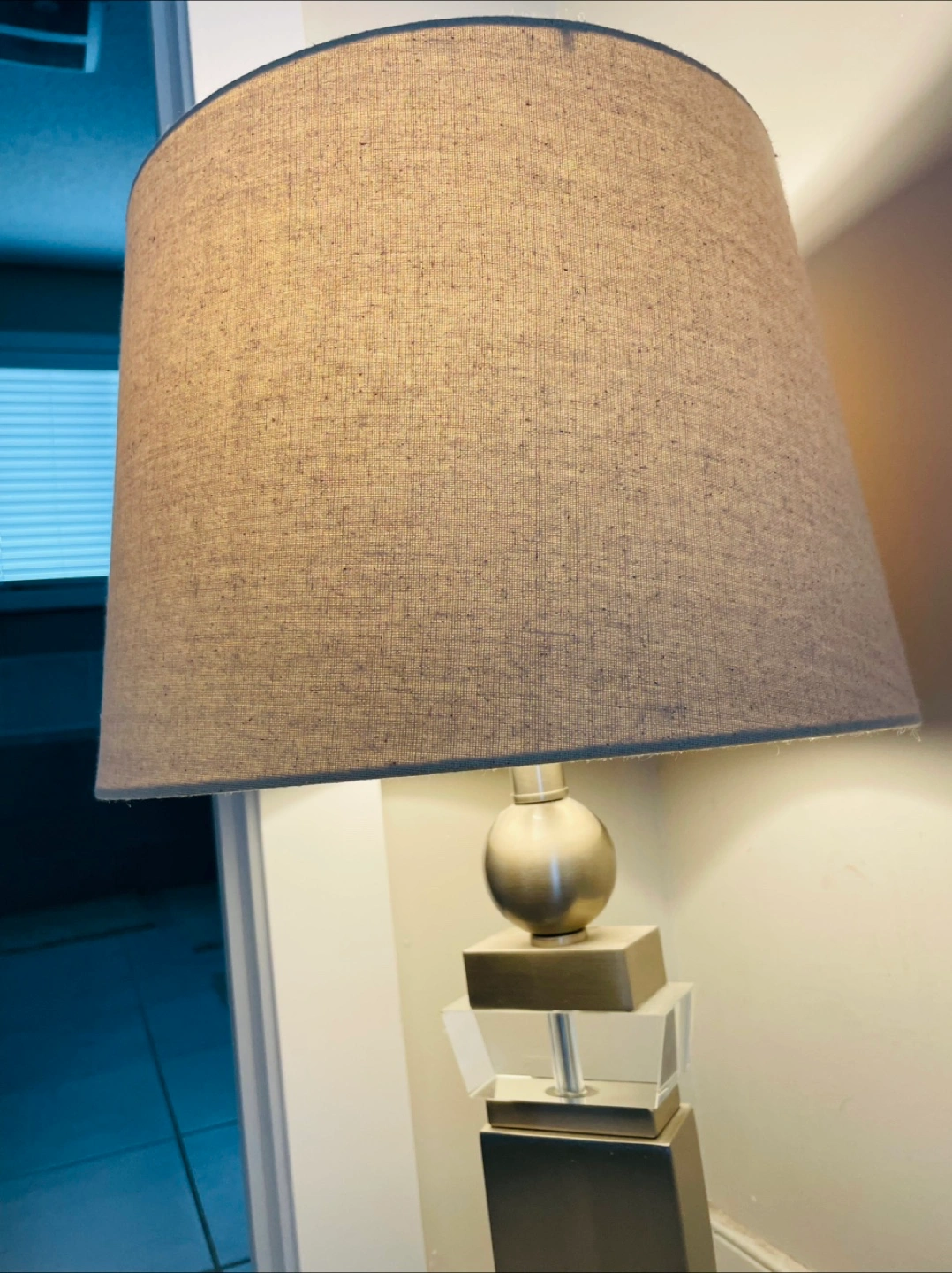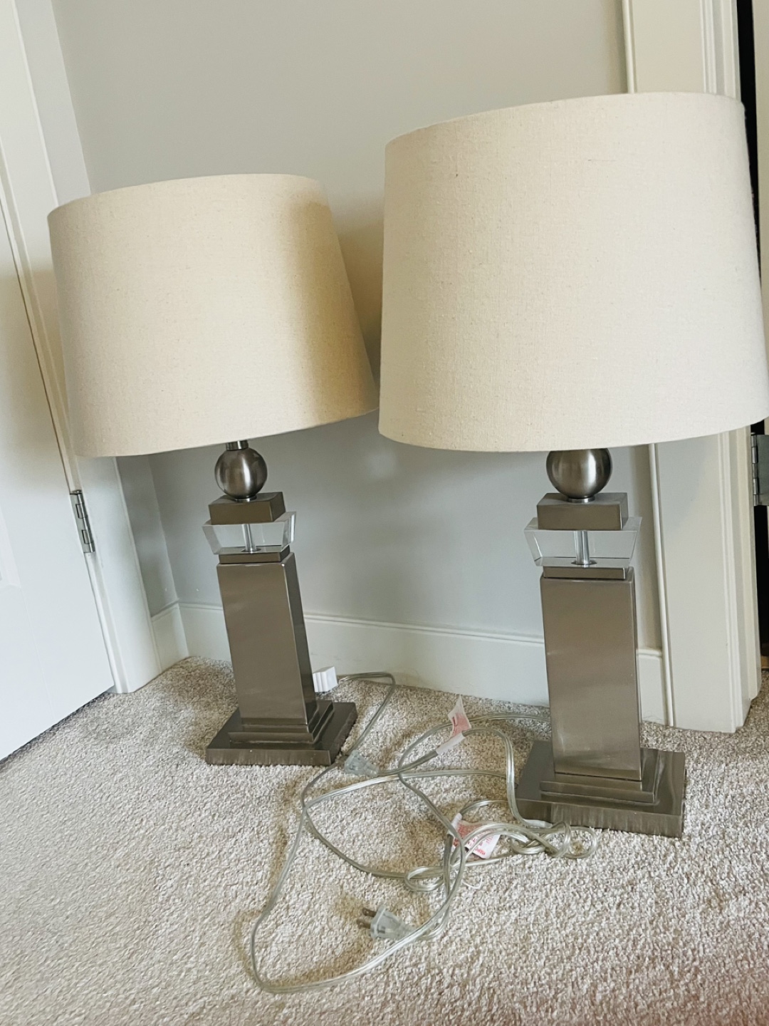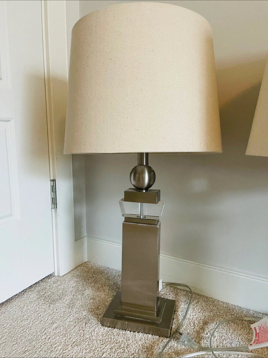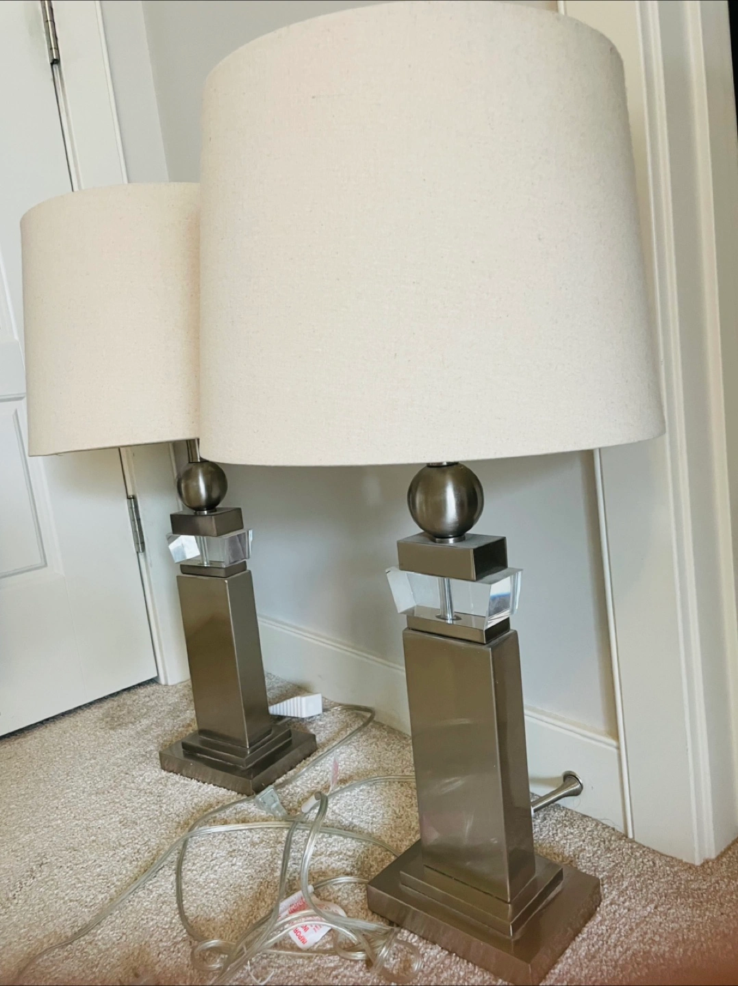 Selling a set of two table lamps. They feature a square base with a crystal accent and a beige lampshade. Great for adding a touch of elegance to any room.