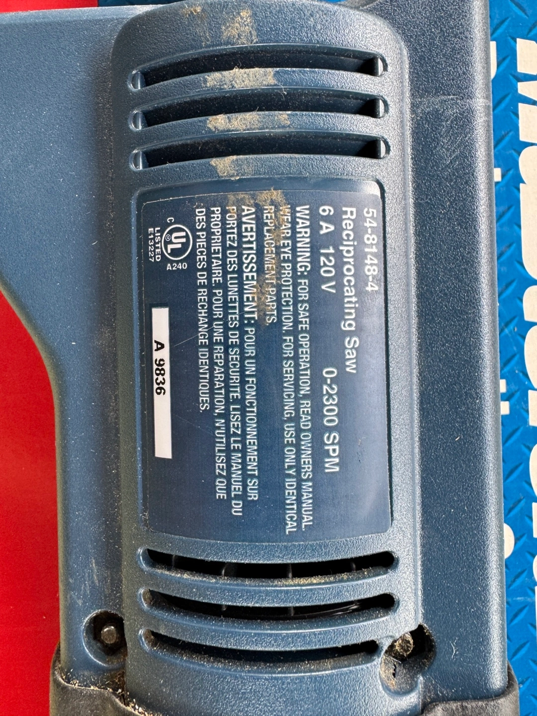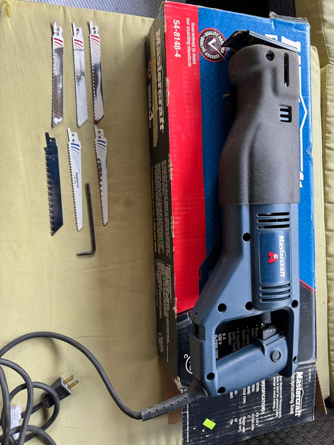 235Selling a Mastercraft reciprocating saw, model 54-8148-4. It operates at 6A 120V and 0-2300 SPM. Comes with several replacement blades and its original box