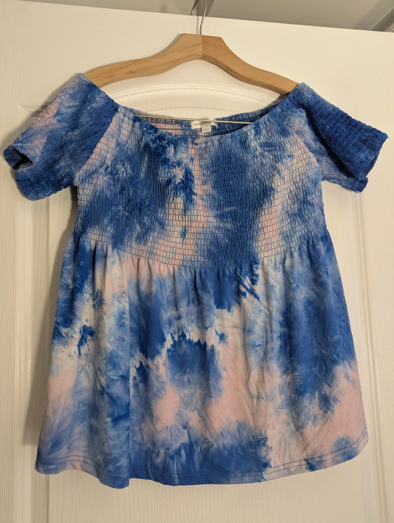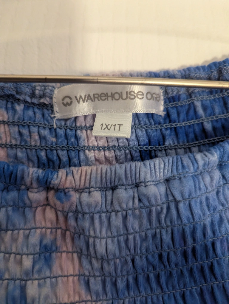 This cute Warehouse One top is in a size 1X. It features a trendy tie-dye pattern in shades of blue and white. Perfect for a casual, comfy look!
