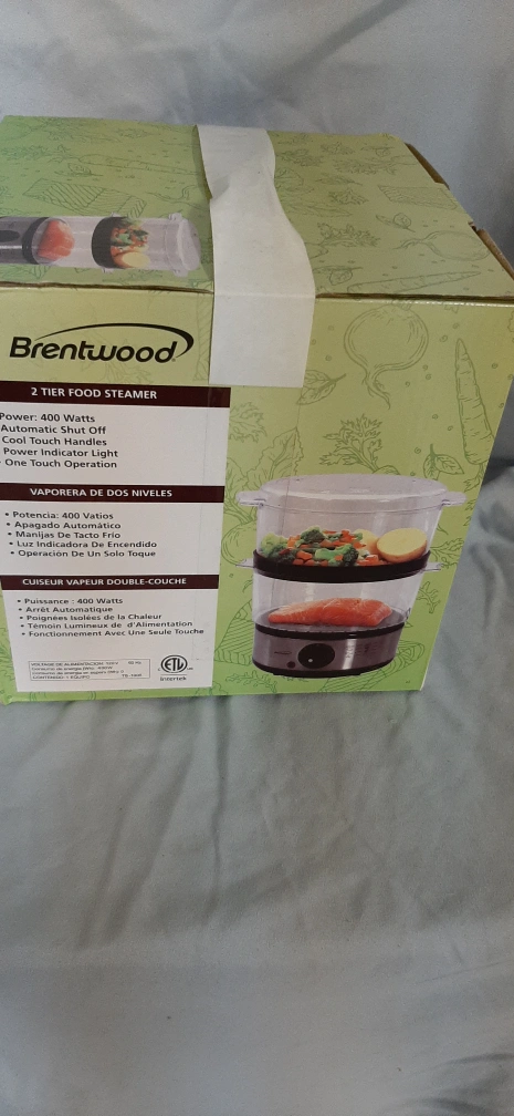 I'm selling a brand new Brentwood 2 Tier Food Steamer, still in its original box! This steamer has a 5 quart / 4.7 liter capacity and features a 60 minute timer. It's equipped with 400 Watts of power, automatic shut off, and a power indicator light. The parts are also dishwasher safe for easy cleaning