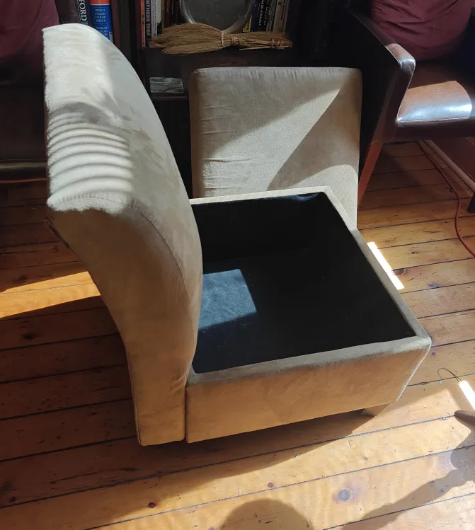 Selling a beige storage ottoman in good condition. It's a great piece for adding extra seating and storage to any room. The ottoman has a lift-up top, revealing a spacious storage compartment inside. Perfect for storing blankets, pillows, or other household items
