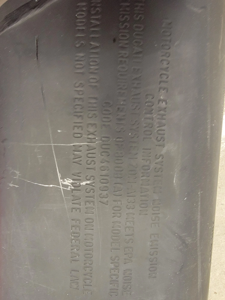 Selling a used Ducati motorcycle exhaust system. It meets EPA noise emission requirements. Code is DUC46109937.