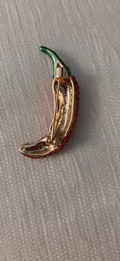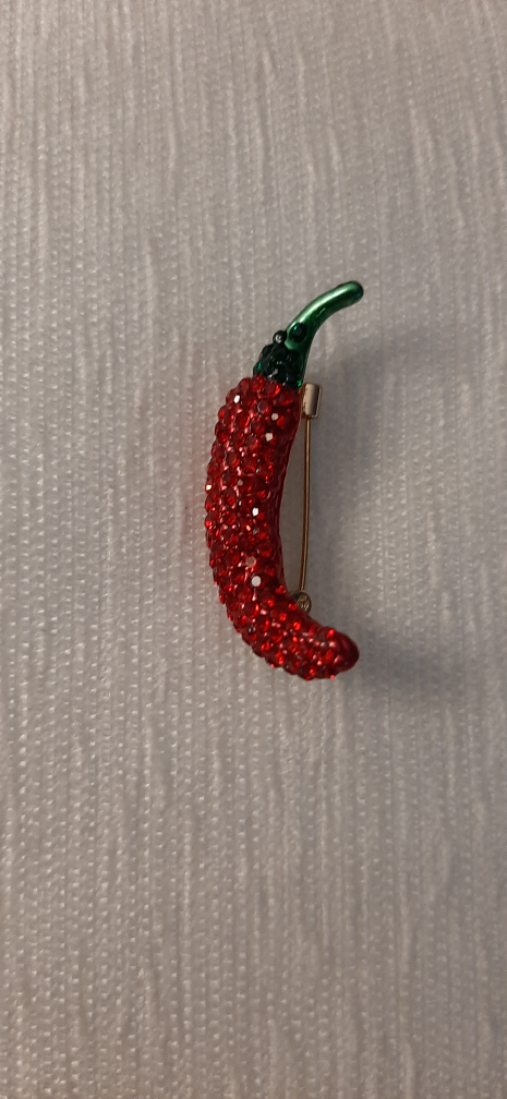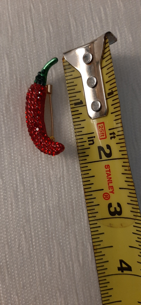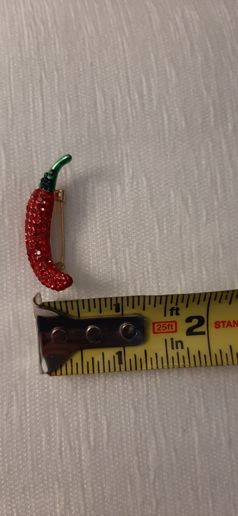 Cute red rhinestone chili pepper pin! It measures about 2 inches in length. Perfect for adding a little spice to your outfit!