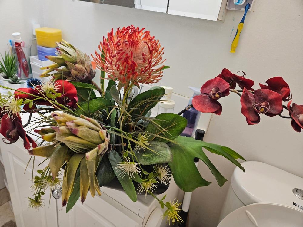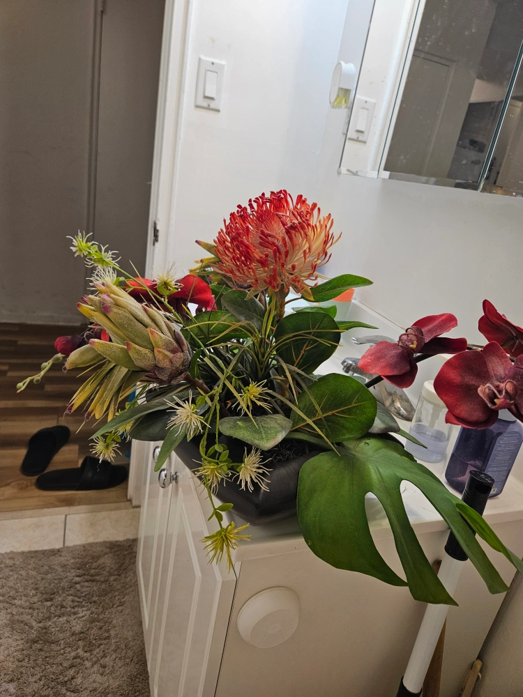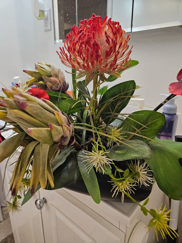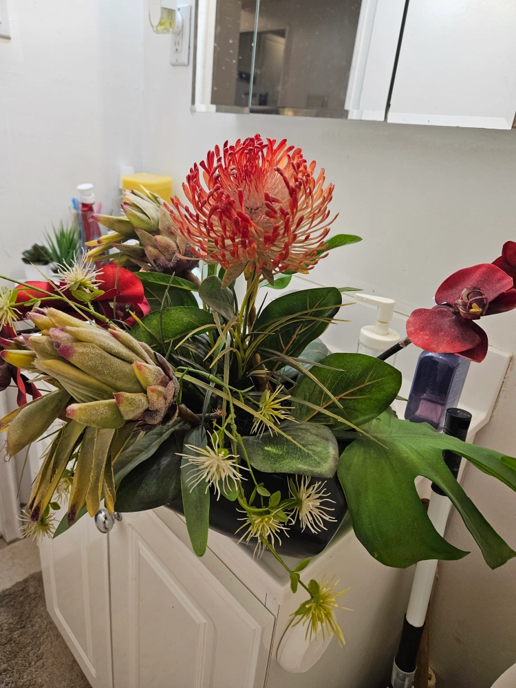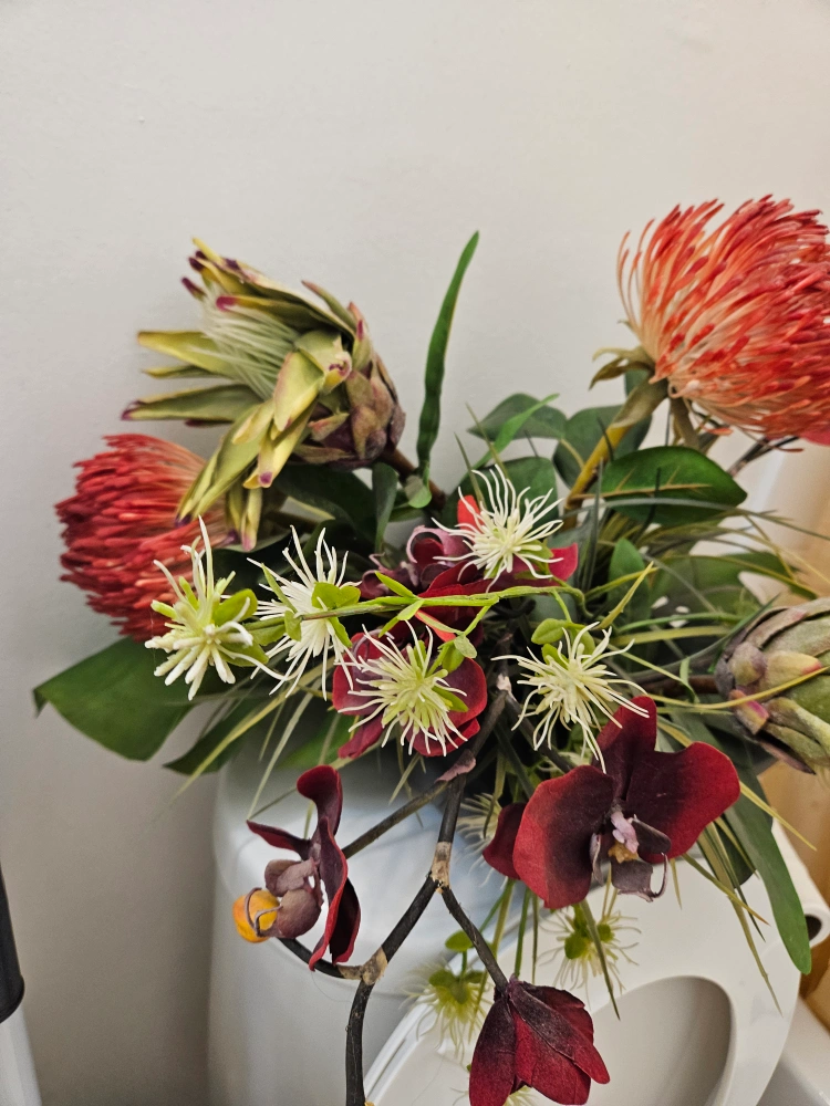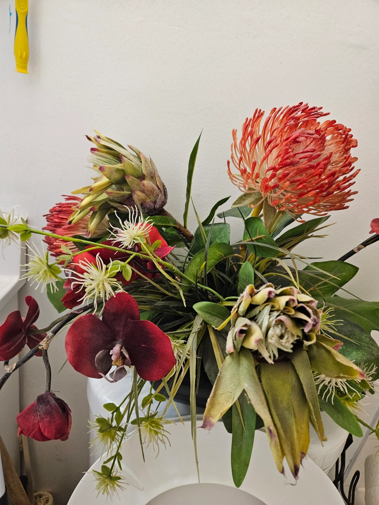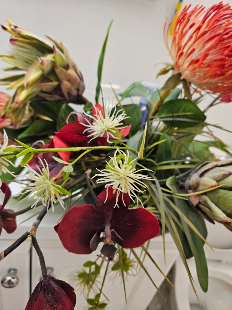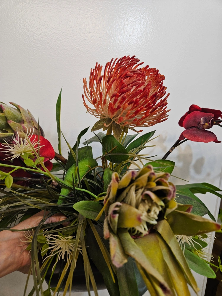 A beautiful floral arrangement featuring protea, orchids, and other greenery in a sleek black vase. It would look great as a centrepiece or to brighten up any room!