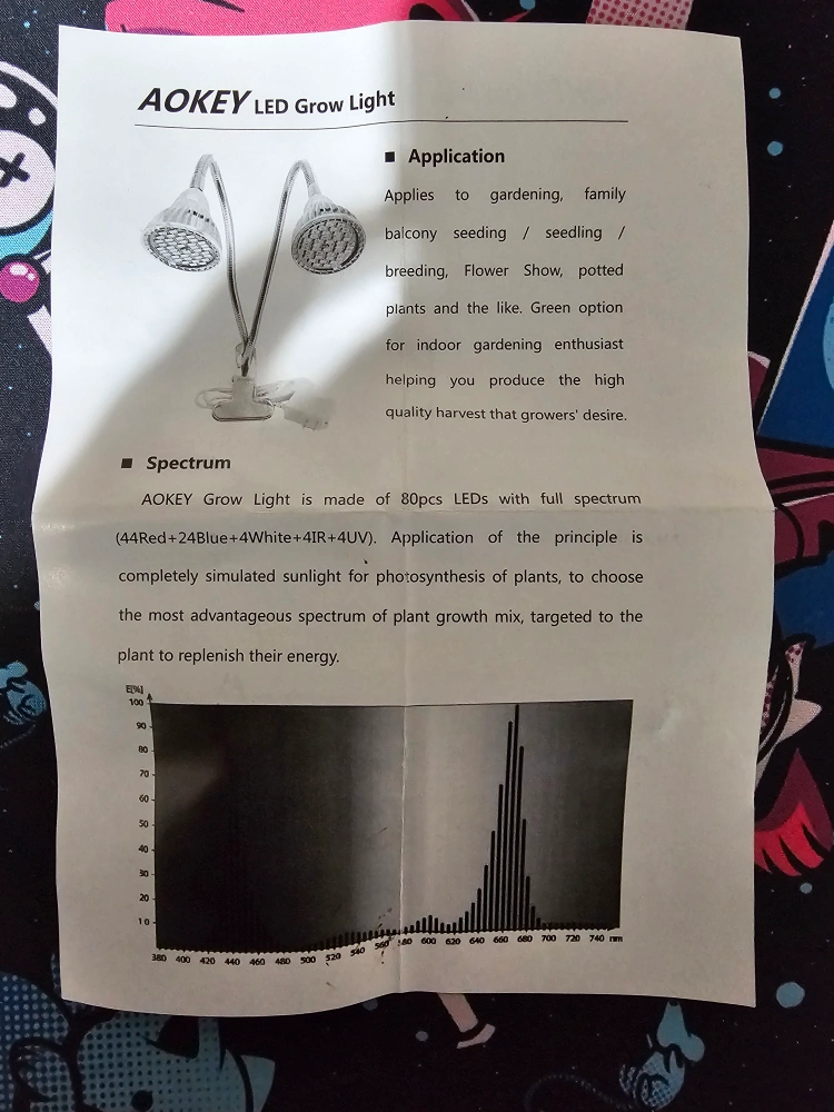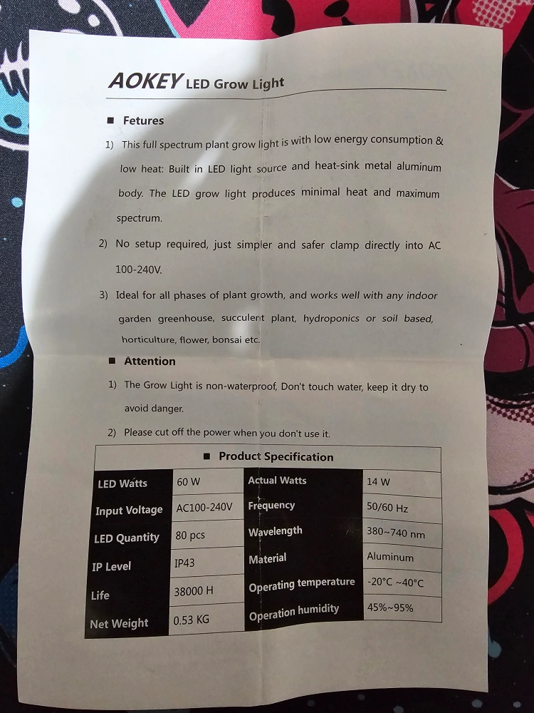 I'm selling an AOKEY LED Grow Light. It applies to gardening, family balcony seeding, flower shows, potted plants, and the like. It's a green option for indoor gardening enthusiasts, helping you produce the high-quality harvest that growers desire. The grow light is made of 80pcs LEDs with a full spectrum. It has low energy consumption and low heat. It's built with an LED light source and heat-sink metal aluminum body. The LED grow light produces minimal heat and maximum spectrum. No setup is required, just simpler and safer clamp directly into AC 100-240V. It's ideal for all phases of plant growth, and works well with any indoor garden greenhouse, succulent plant, hydroponics, or soil based horticulture, flower, bonsai, etc.