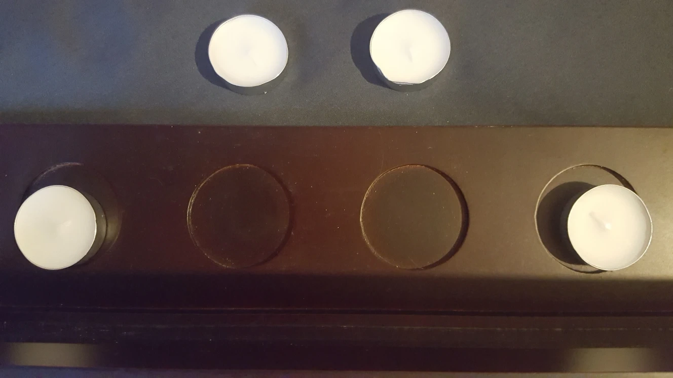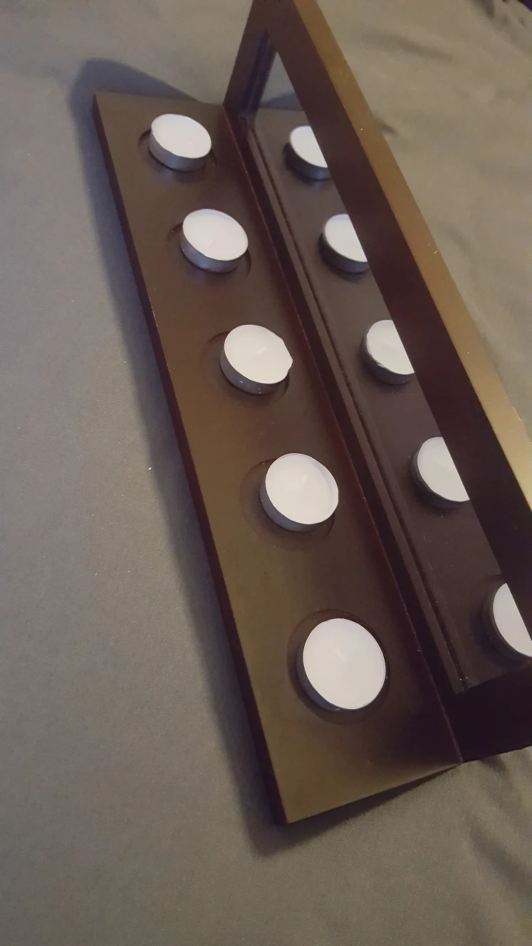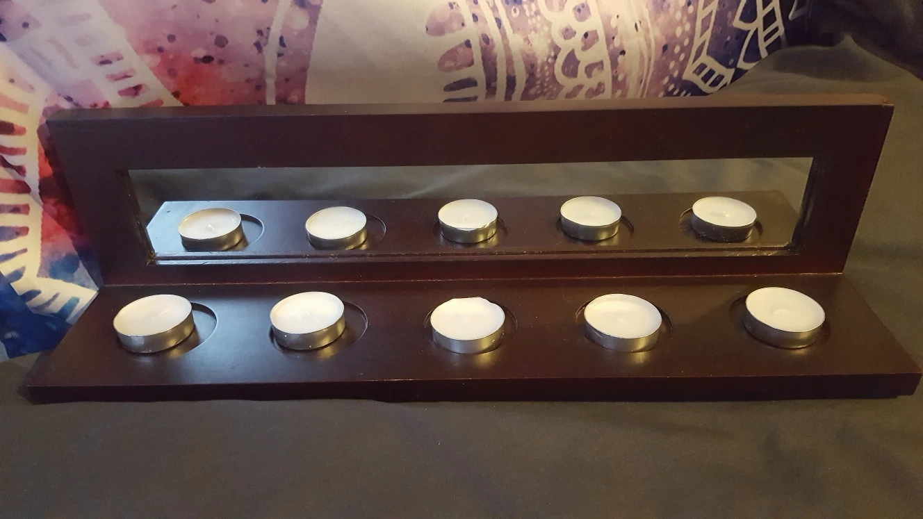 This unique candle holder can be hung on the wall, to create a lovely ambiance for any room. The mirror built into the back of the holder helps to reflect light out into your space when candles are lit. Small circle impressions can hold tea lights or small vessels for tea lights in place. Great interchangeable piece for a lot of different decor styles. I am including 5 tea lights with this item.