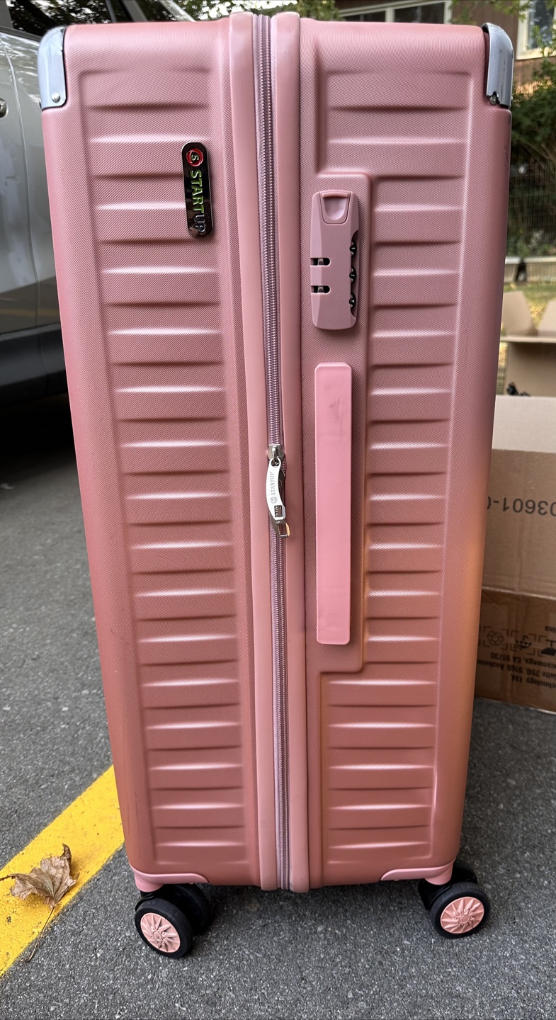 Selling a pink Startup suitcase. It's in great condition and ready for your next trip! It has a combination lock for added security and a retractable handle for easy maneuvering. Used once.