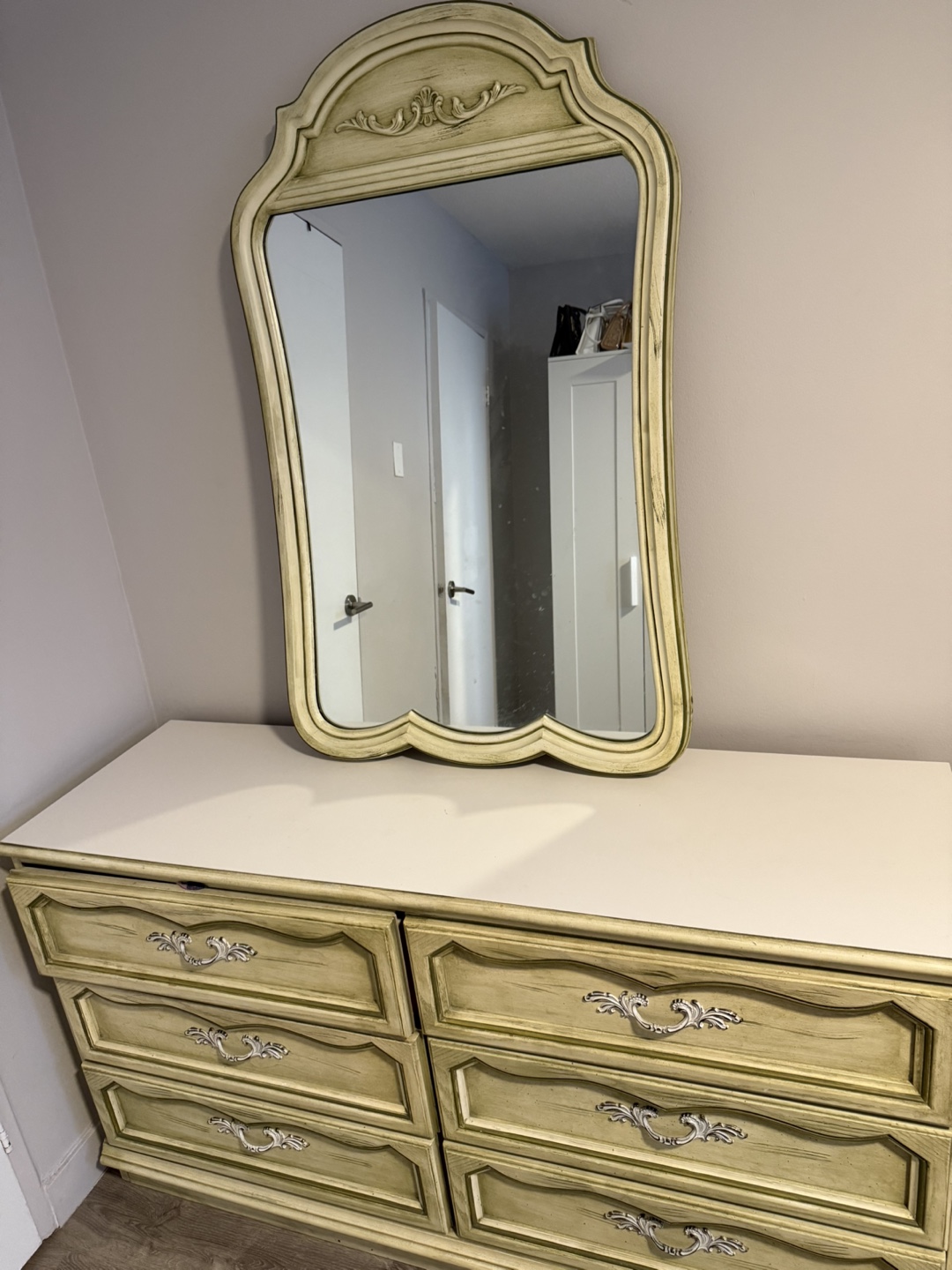 Selling a beautiful vintage dresser with a matching mirror. The dresser has six drawers and is finished in a beige/gold colour. It would make a great addition to any bedroom or living space! The dresser and mirror are in good condition, showing some signs of wear consistent with their age