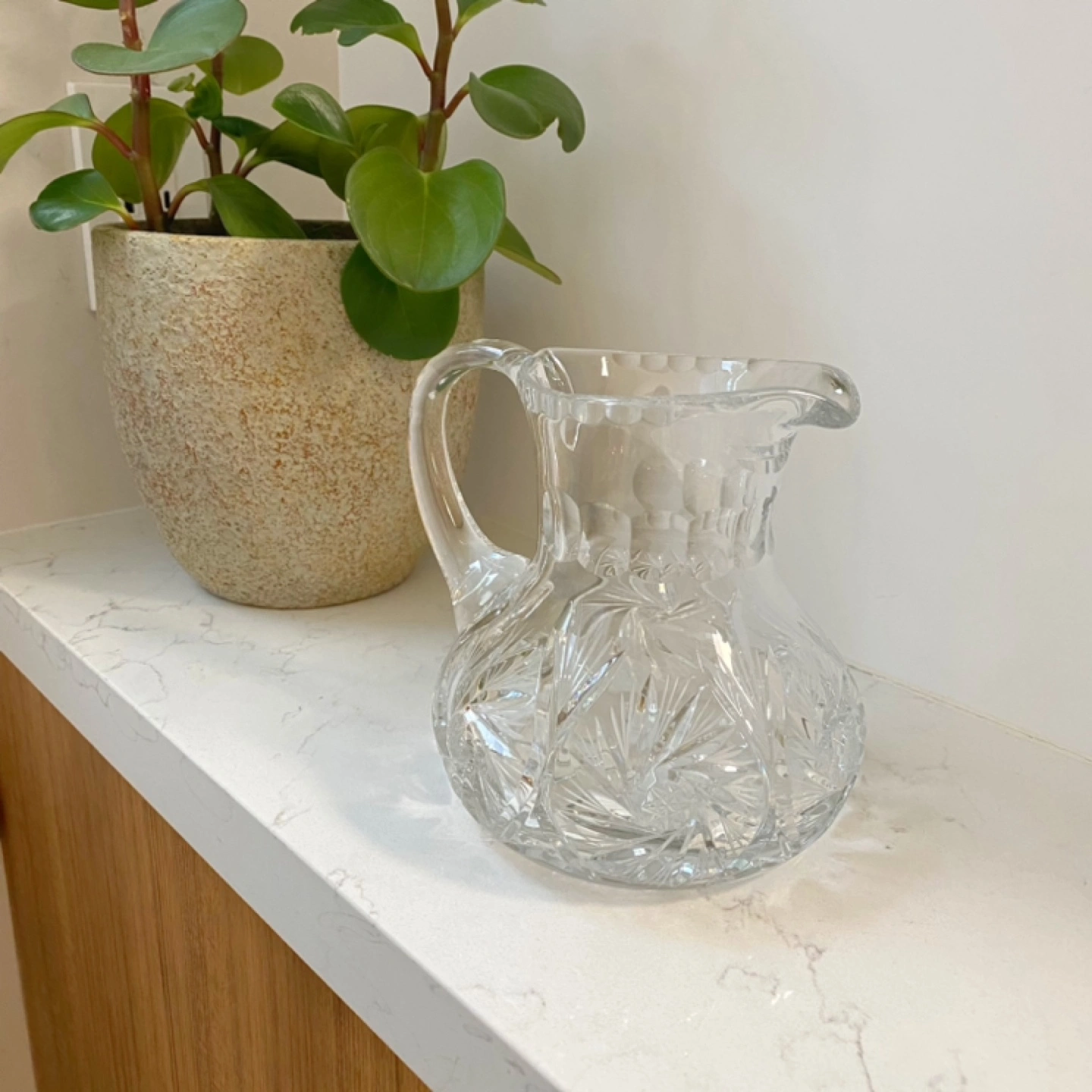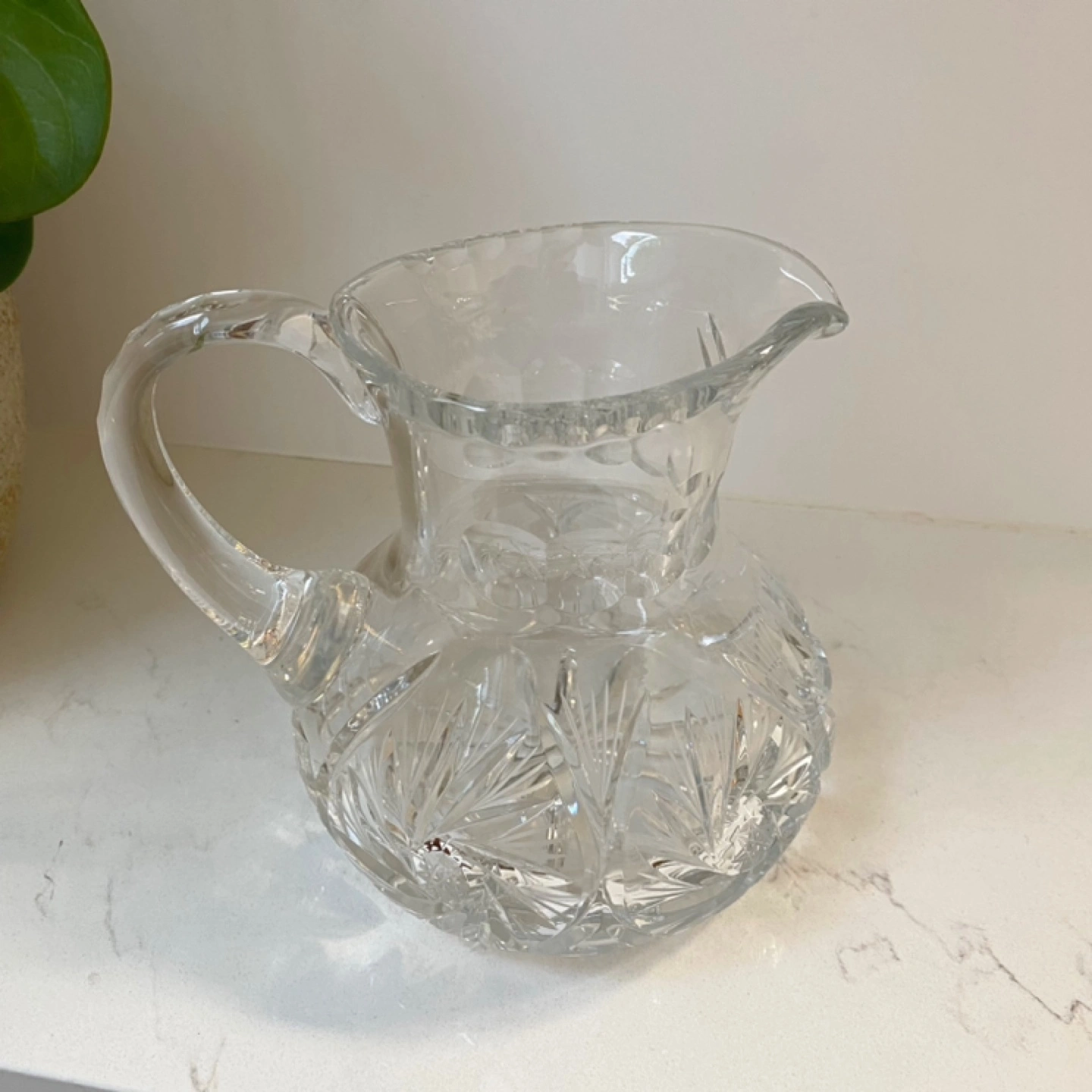 Selling a beautiful crystal glass pitcher. It's in great condition and would be a lovely addition to any table setting! It has a lovely pattern all around the pitcher.