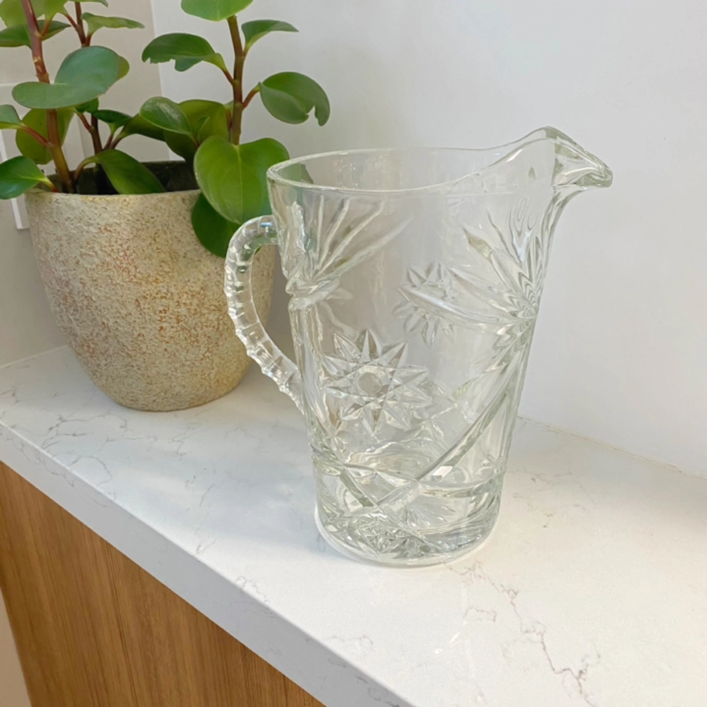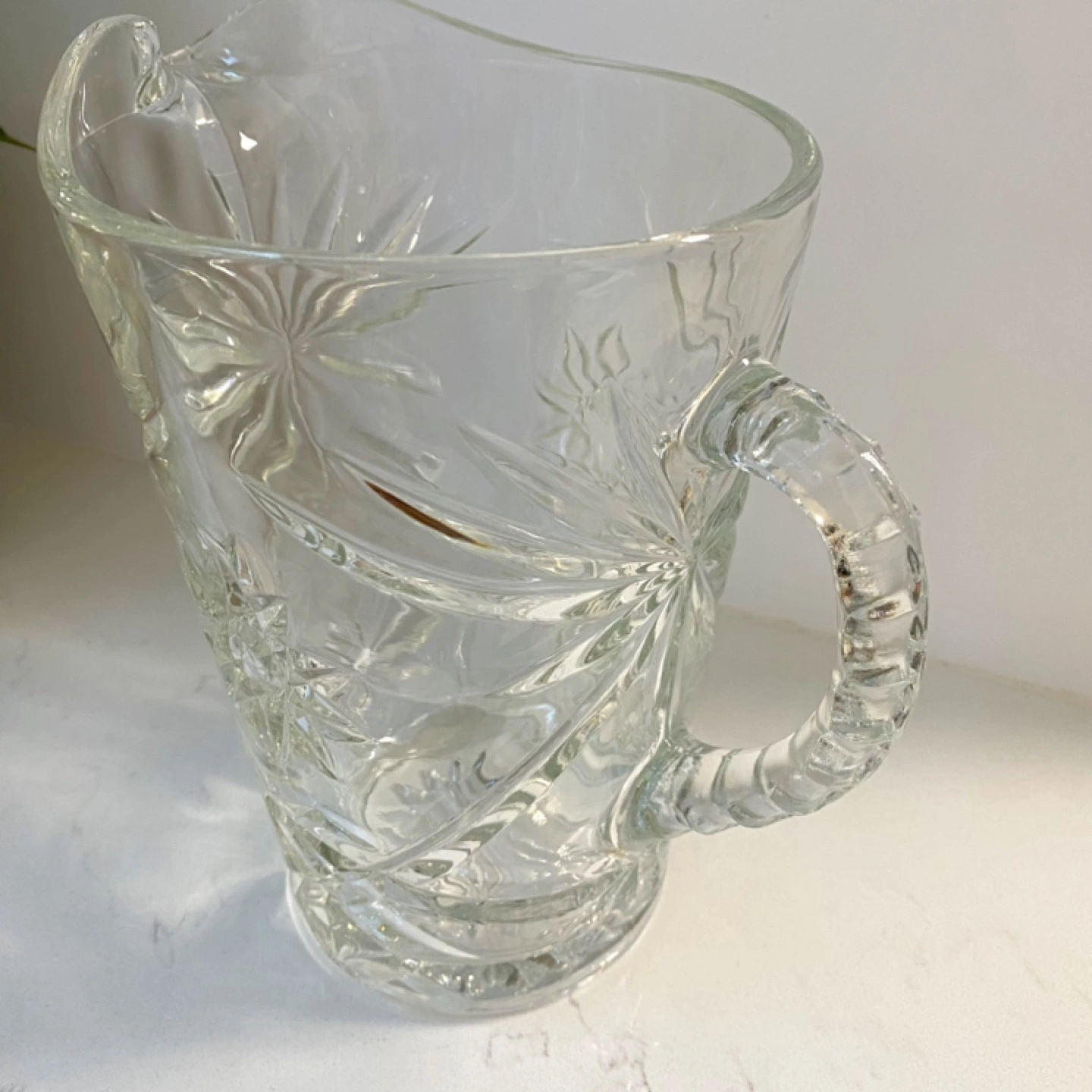 Selling a lovely vintage clear glass pitcher. It has a beautiful starburst pattern etched into the glass. Perfect for serving lemonade or iced tea on a hot day!