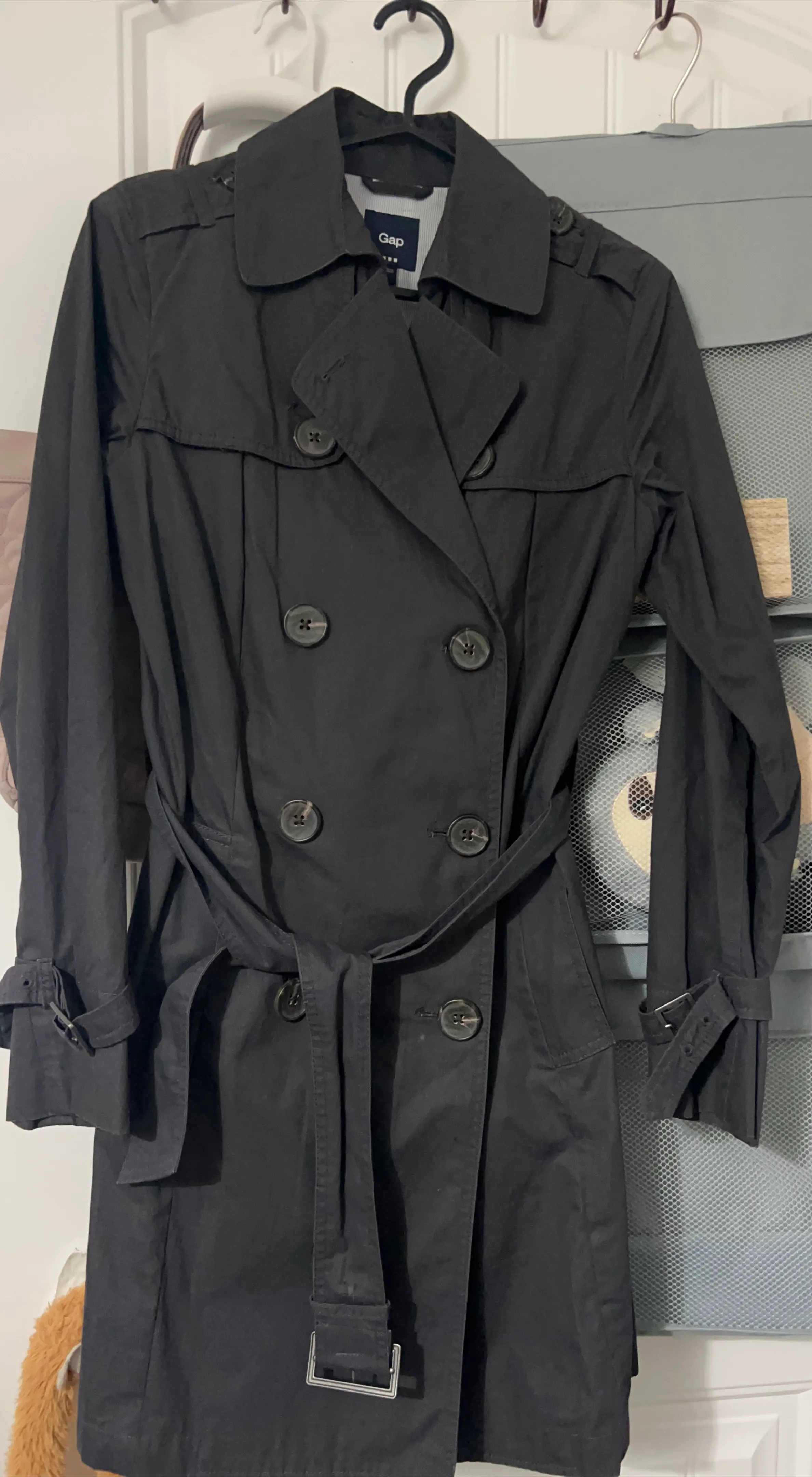 Selling a classic black gray trench coat from Gap! It's in great shape and ready for a new home. Perfect for those in-between weather days or adding a touch of sophistication to your outfit