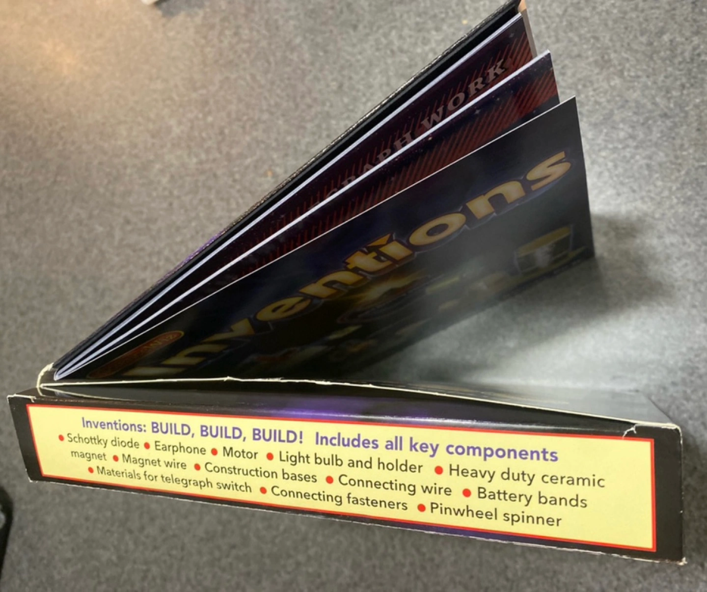 It includes all the key components to build your own inventions. The box includes a Schottky diode, earphone, motor, light bulb and holder, magnet wire, construction bases, connecting wire, battery bands, materials for telegraph switch, connecting fasteners, and a pinwheel spinner. Let your imagination run wild!