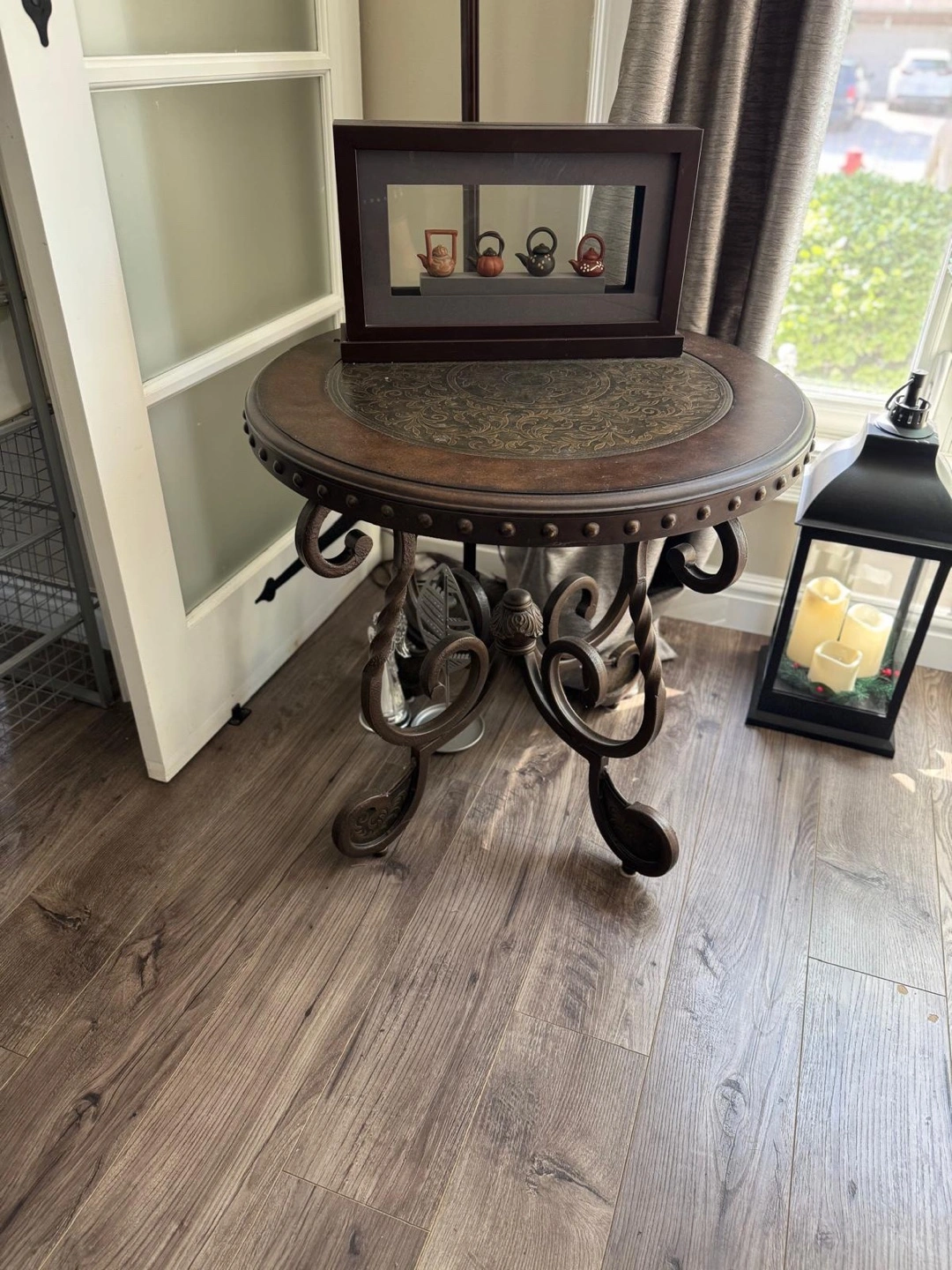 Selling a lovely antique-style round accent table. It features a decorative metal base with intricate scrollwork and a patterned tabletop. It's perfect for adding a touch of vintage charm to any room!