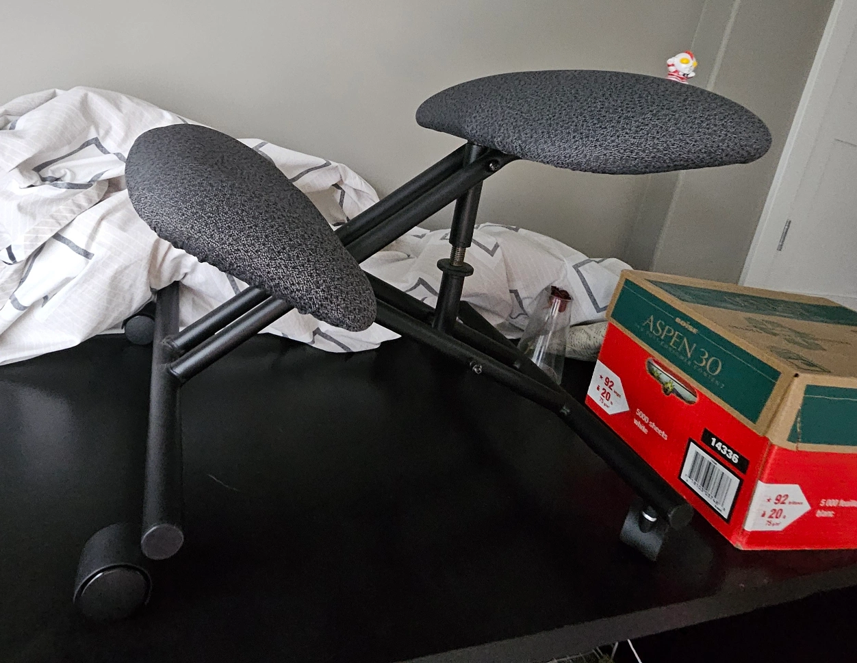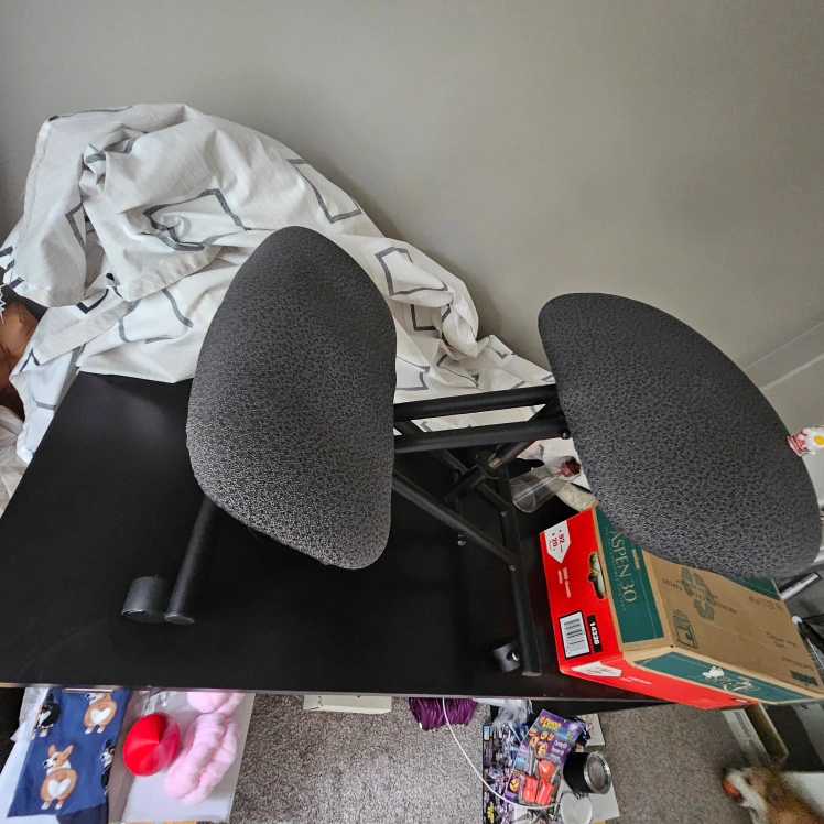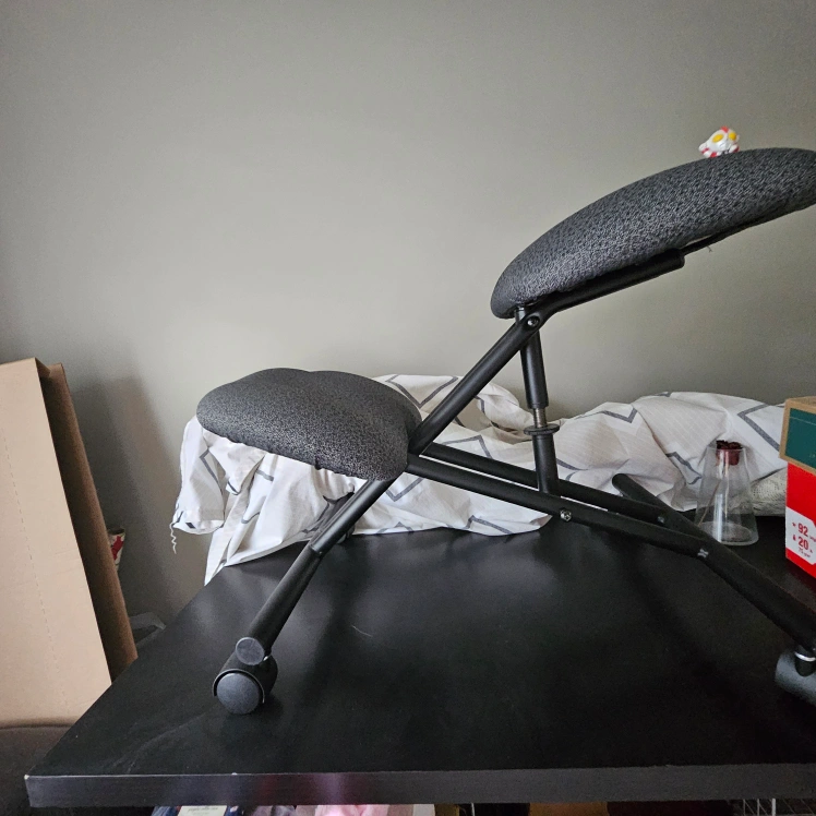 Selling a Varier Variable Balans kneeling chair in great condition! This ergonomic chair is designed to promote good posture and reduce back pain. It features a comfortable seat and knee rests, and the adjustable height ensures a perfect fit. Perfect for home or office use!