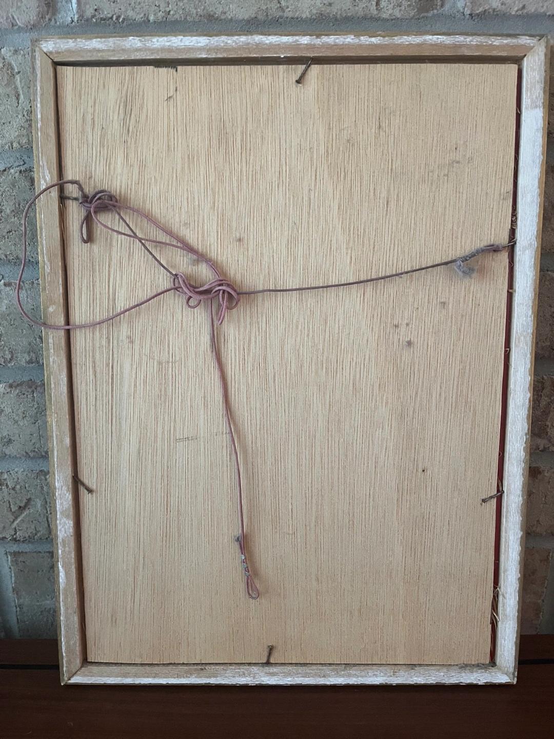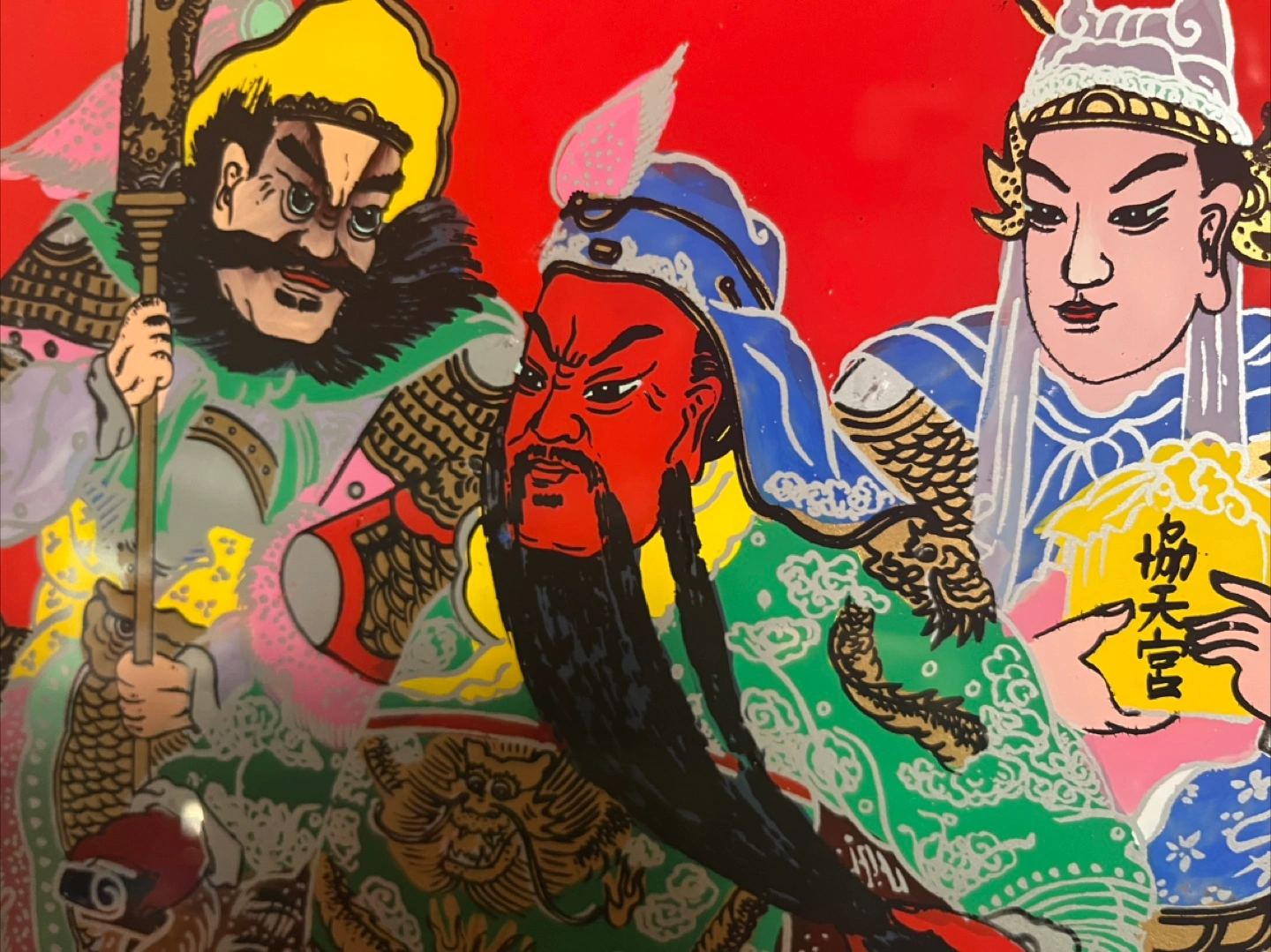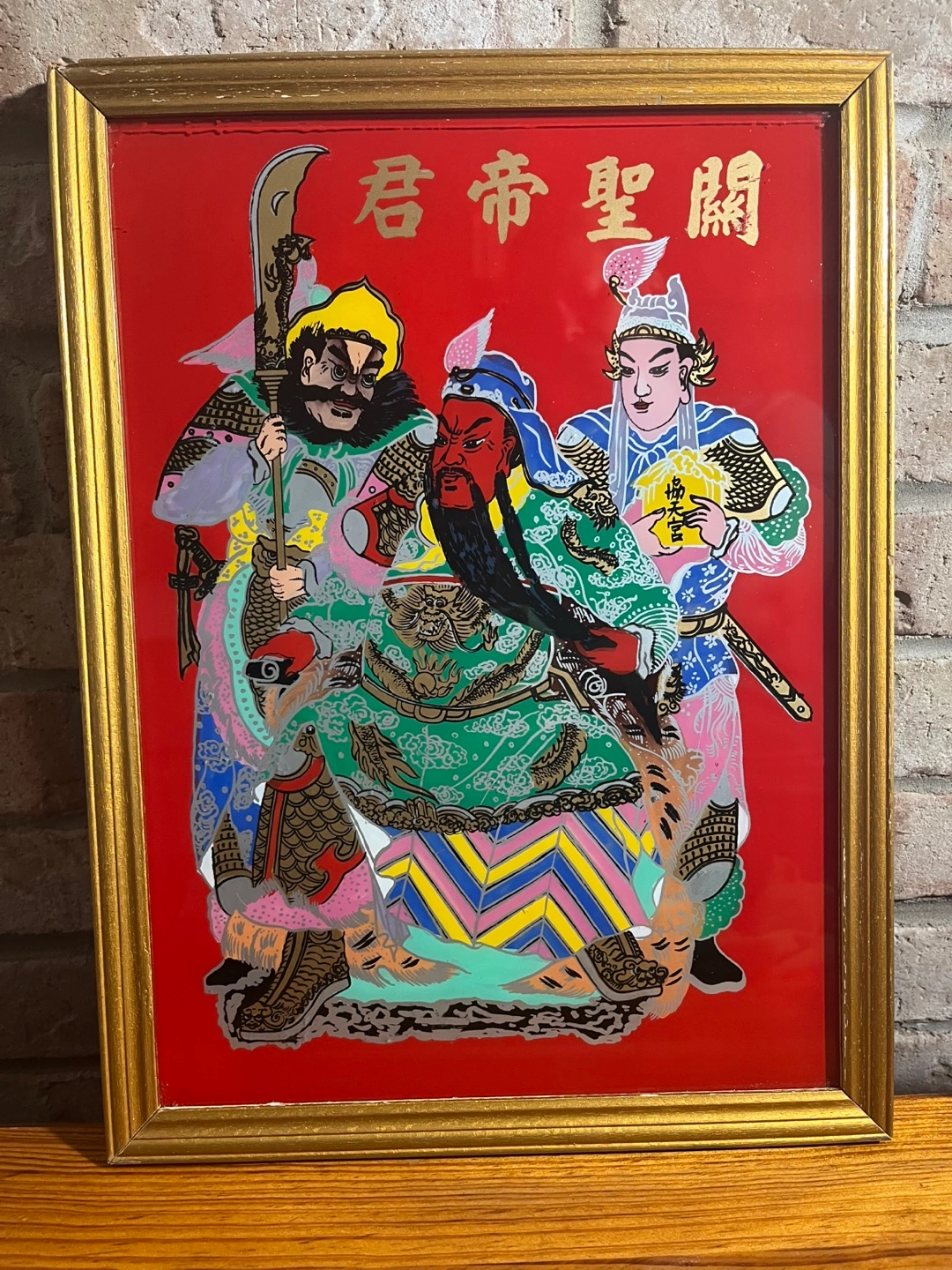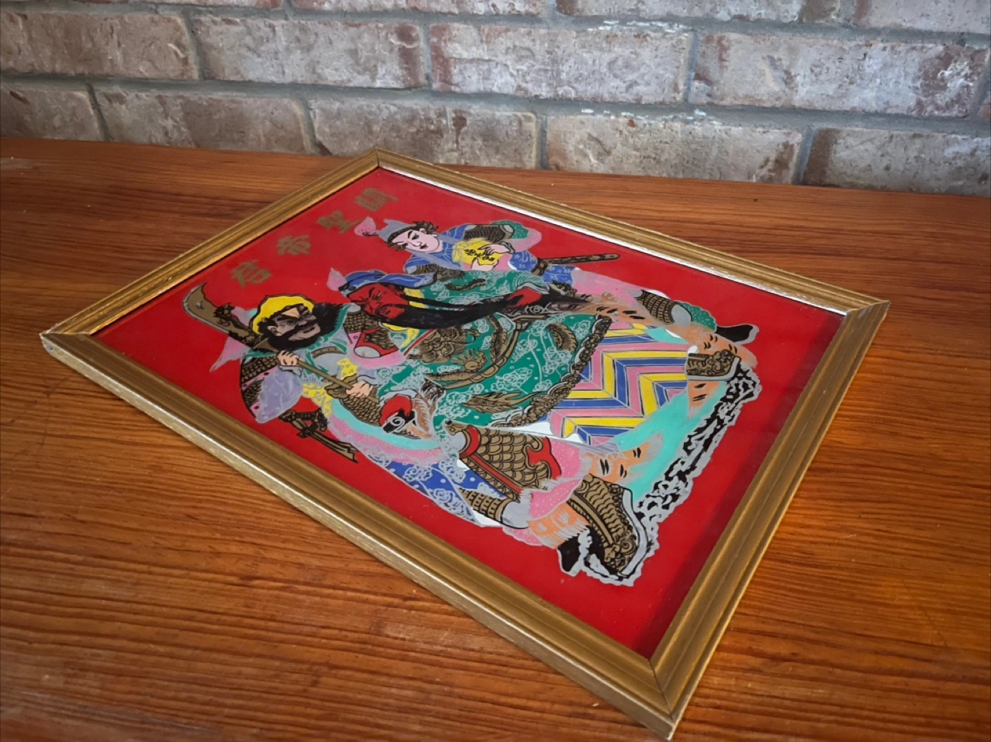 Vintage reverse glass painting of Chinese god of war Guan Gong Yu and his servants. He will protect your house and bring you bravery and luck!purchase on Hong Kong in the 1970s. Measures 15 1/4 x 11 1/4 inches (including frame).