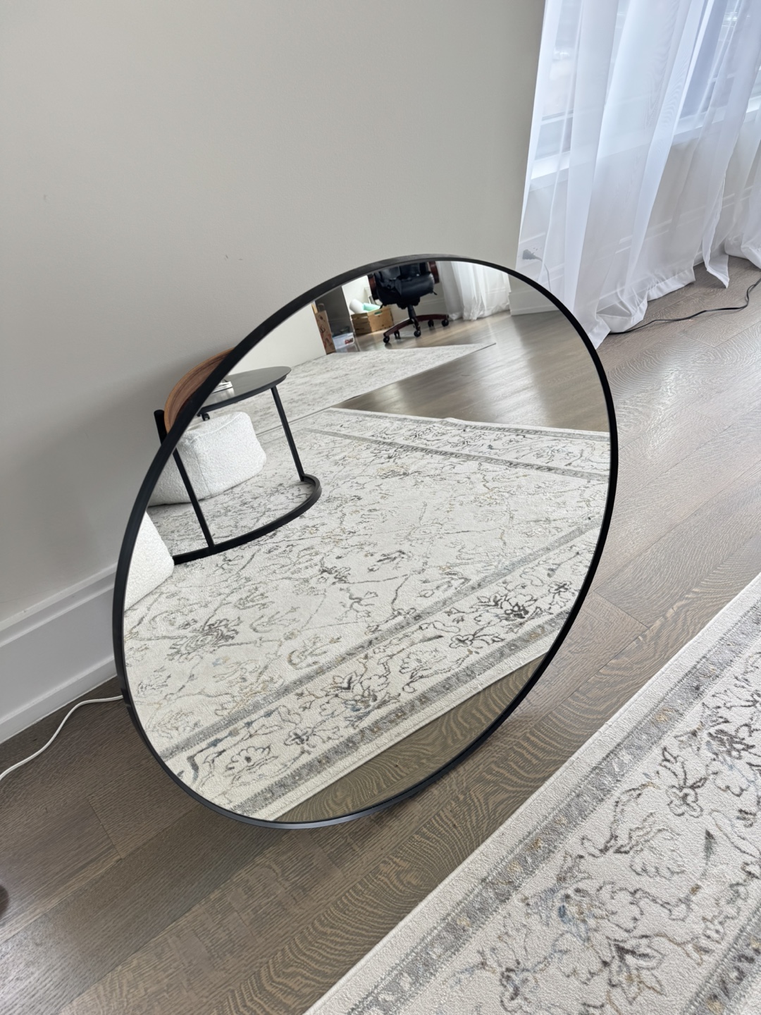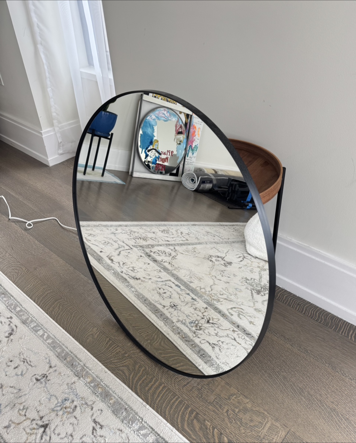 Selling a stylish round mirror featuring a sleek black frame! By decorating with mirrors, you add depth to a room and give it more life. The round LINDBYN mirror has a soft expression and the black frame and neat design feel elegant.