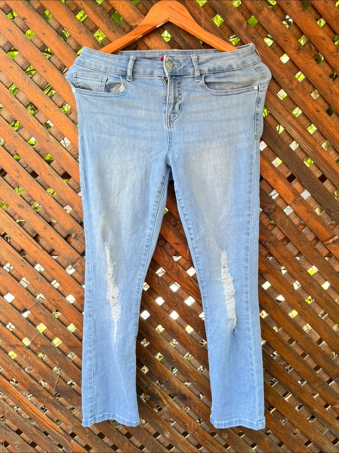 Selling a pair of Guess Los Angeles jeans in a light wash. They have a bit of a distressed look with some rips. Great for a casual, stylish look!