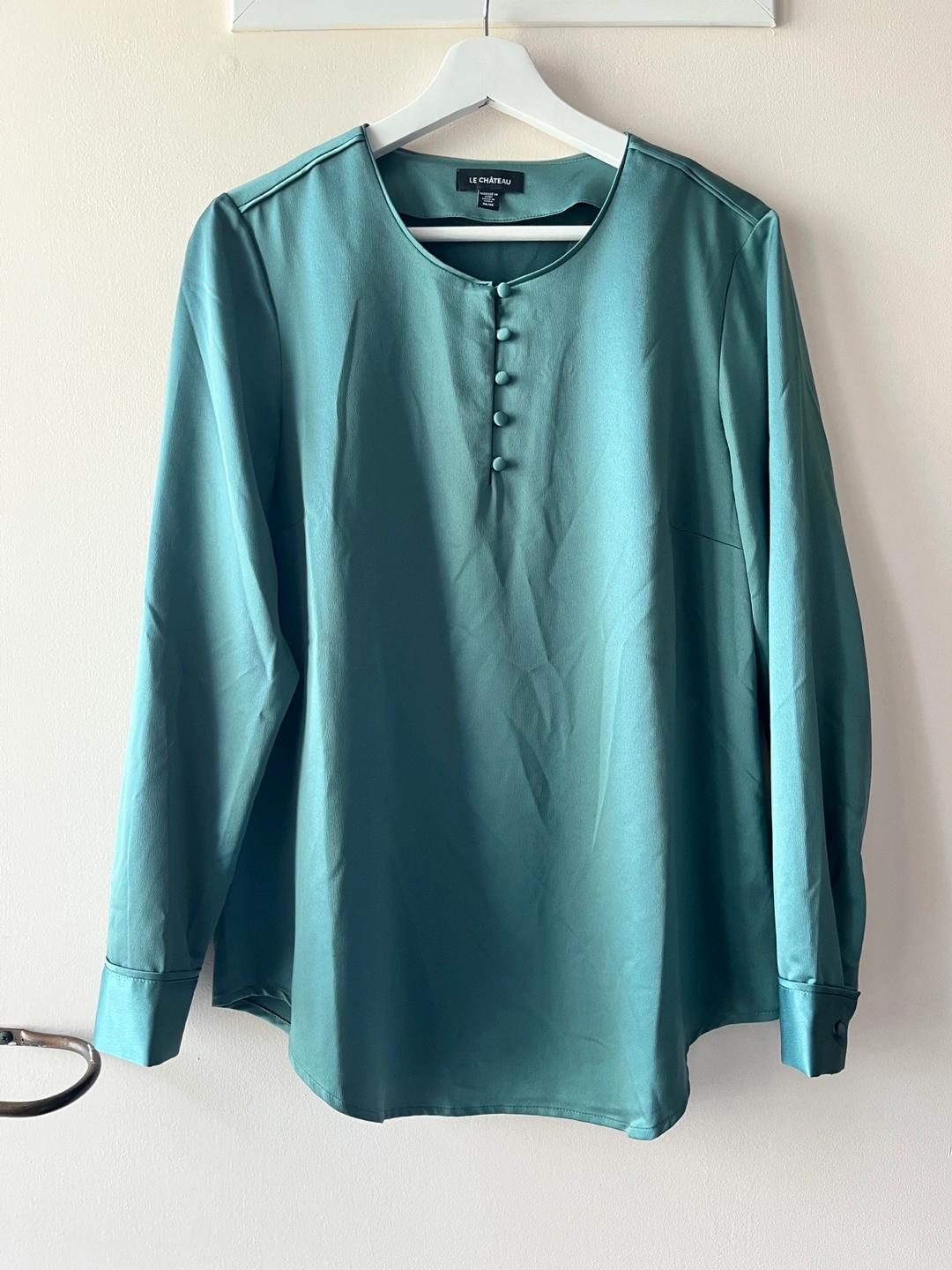 Selling a lovely Le Chateau blouse in a beautiful green colour! It's a size medium and made of a smooth, silky material. Perfect for dressing up or down!