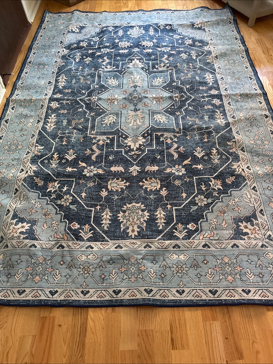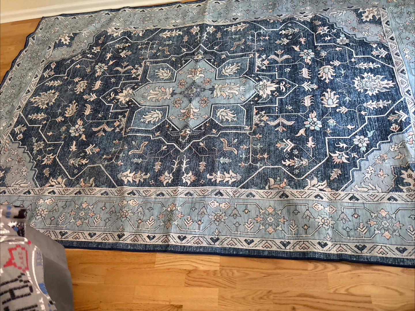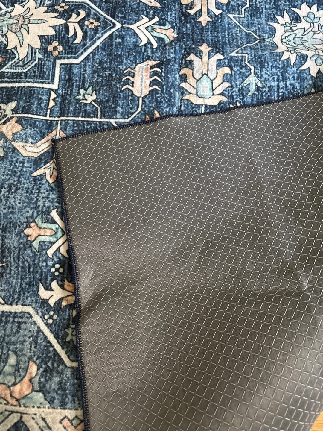 Beautiful blue medallion area rug, perfect for adding a touch of elegance to any room. The rug features a detailed floral and geometric pattern in shades of blue, gray, and beige. The backing appears to be non-slip, making it a safe and stylish addition to your home