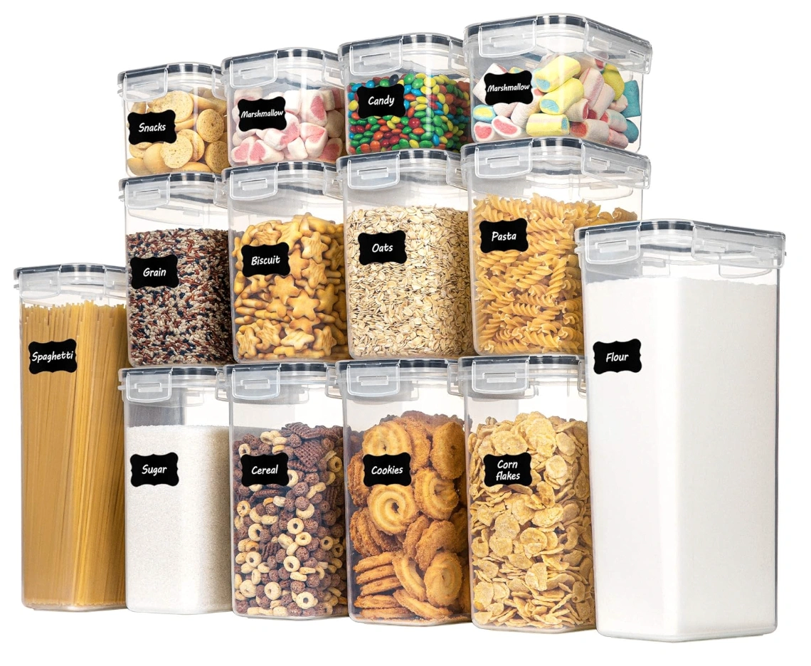 Kitchen & Pantry Organizers and Storage, Plastic Airtight Pantry Storage Container with Lids for Cereal, Flour and Sugar, Includes 24 sticker labels and a white marker.