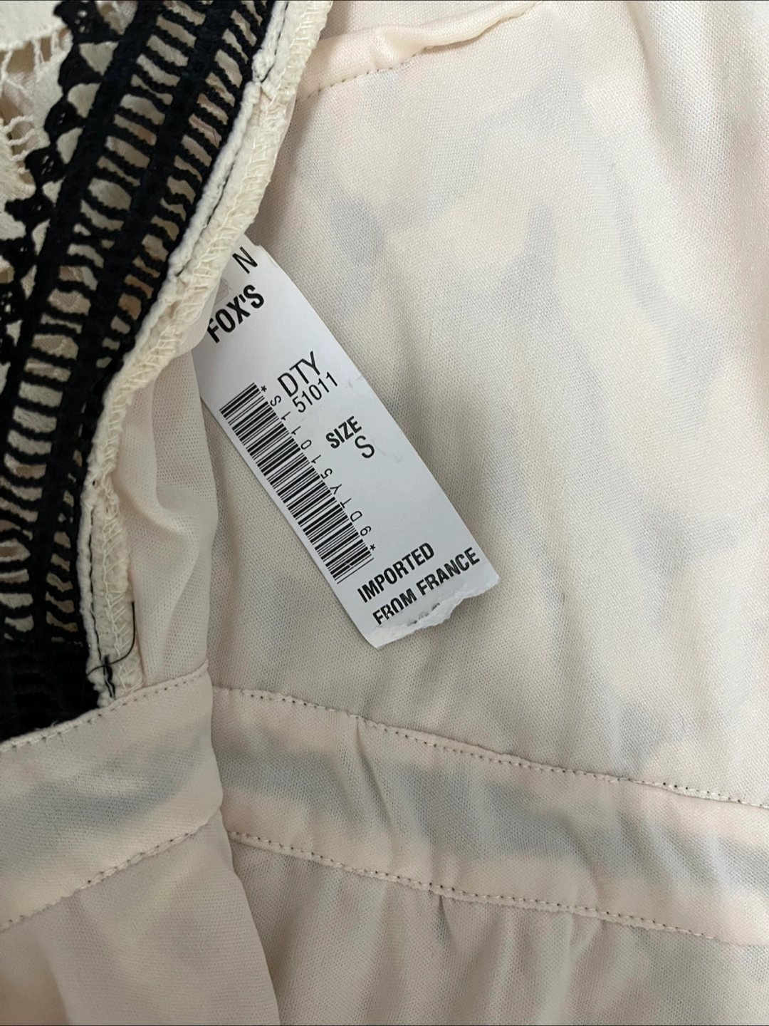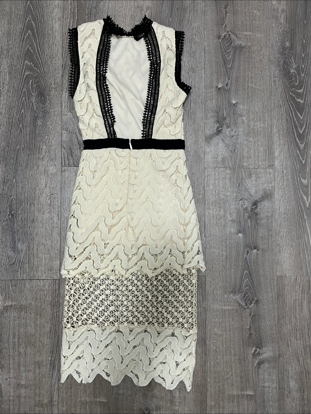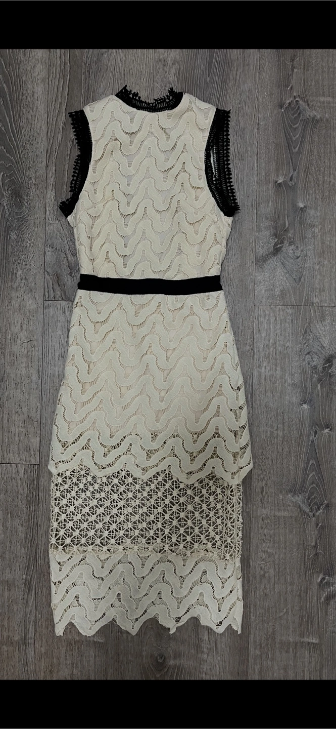 Selling a beautiful cream-colored lace dress from Fox's! It features a lovely lace pattern and black trim, making it perfect for a special occasion. Size is S.