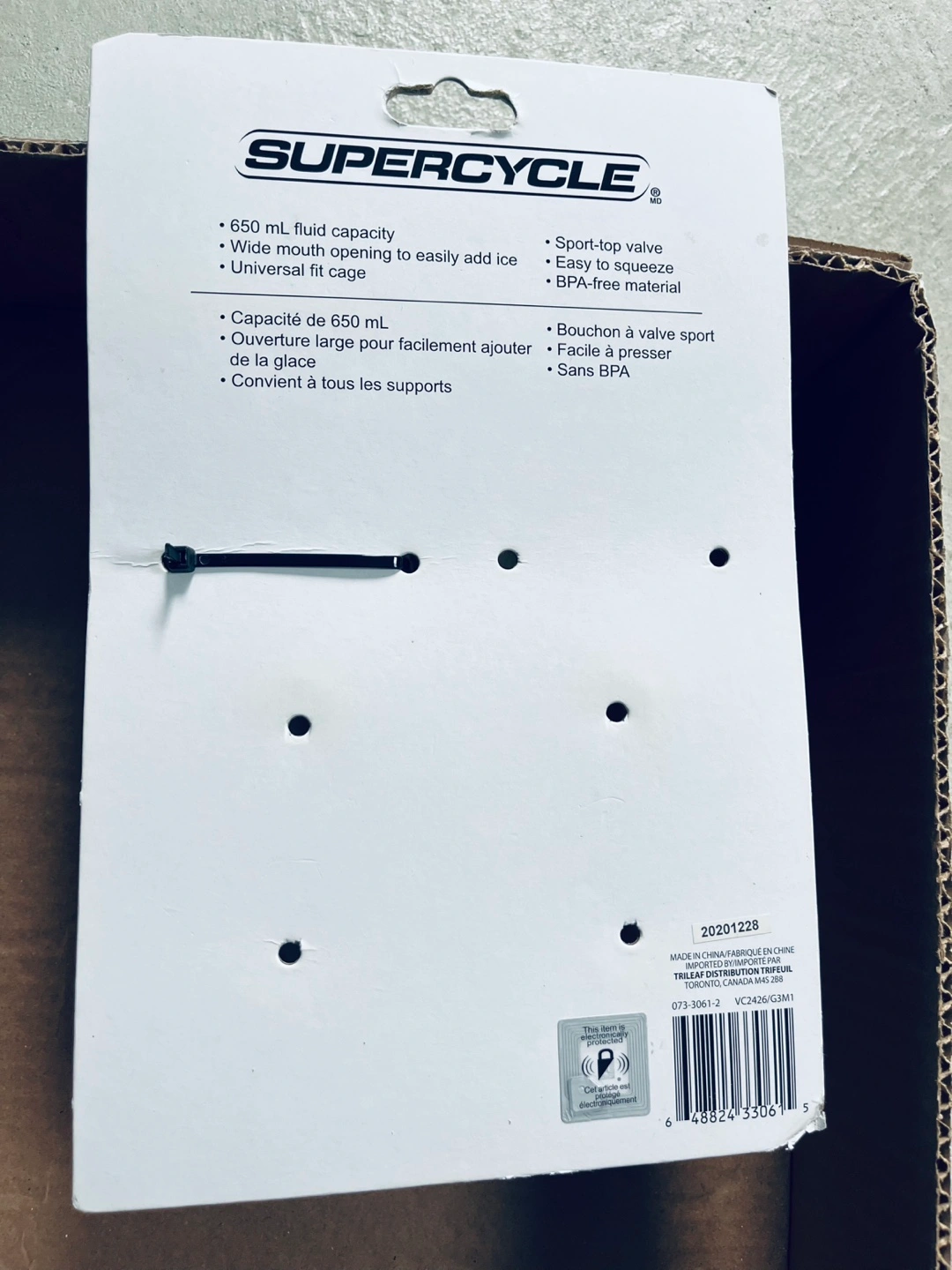 Selling a Supercycle water bottle with a 650 mL fluid capacity. It has a wide mouth opening to easily add ice and fits in a universal fit cage. The bottle also features a sport-top valve and is easy to squeeze, plus it's BPA-free
