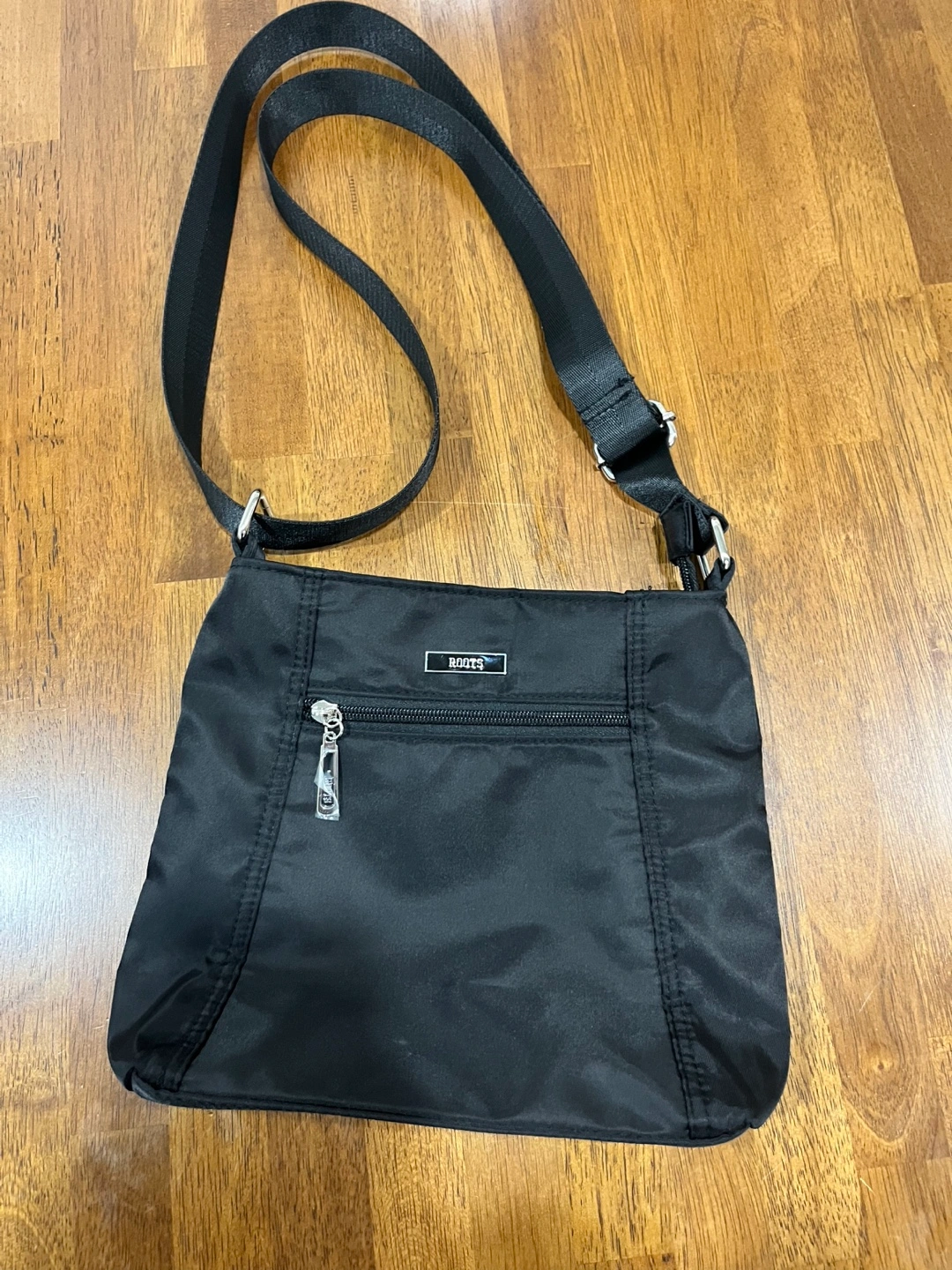 Here's a gently used Roots crossbody bag in black. It's in great condition and perfect for everyday use. The interior lining features the Roots logo pattern, adding a nice touch. It has multiple zippered compartments to keep your belongings organized.