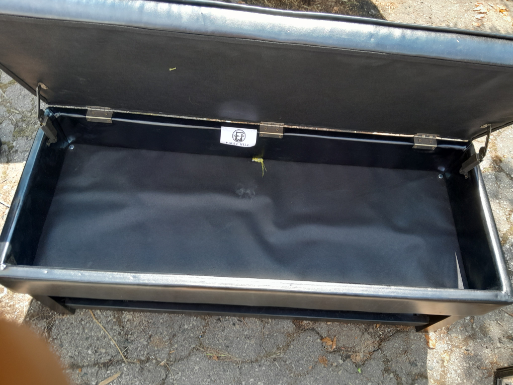 This black storage ottoman bench is perfect for adding extra seating and storage to any room! It has a sleek, tufted design and a spacious interior for storing blankets, pillows, or other items. It's in good condition and ready for a new home small fixable crack near the one leg nothing some glue wouldnt fix.