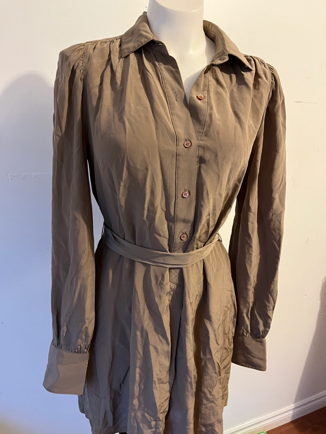 A lovely BCBG MAXAZRIA dress in size small! It's a beautiful neutral colour with long sleeves and a tie waist. Perfect for dressing up or down!