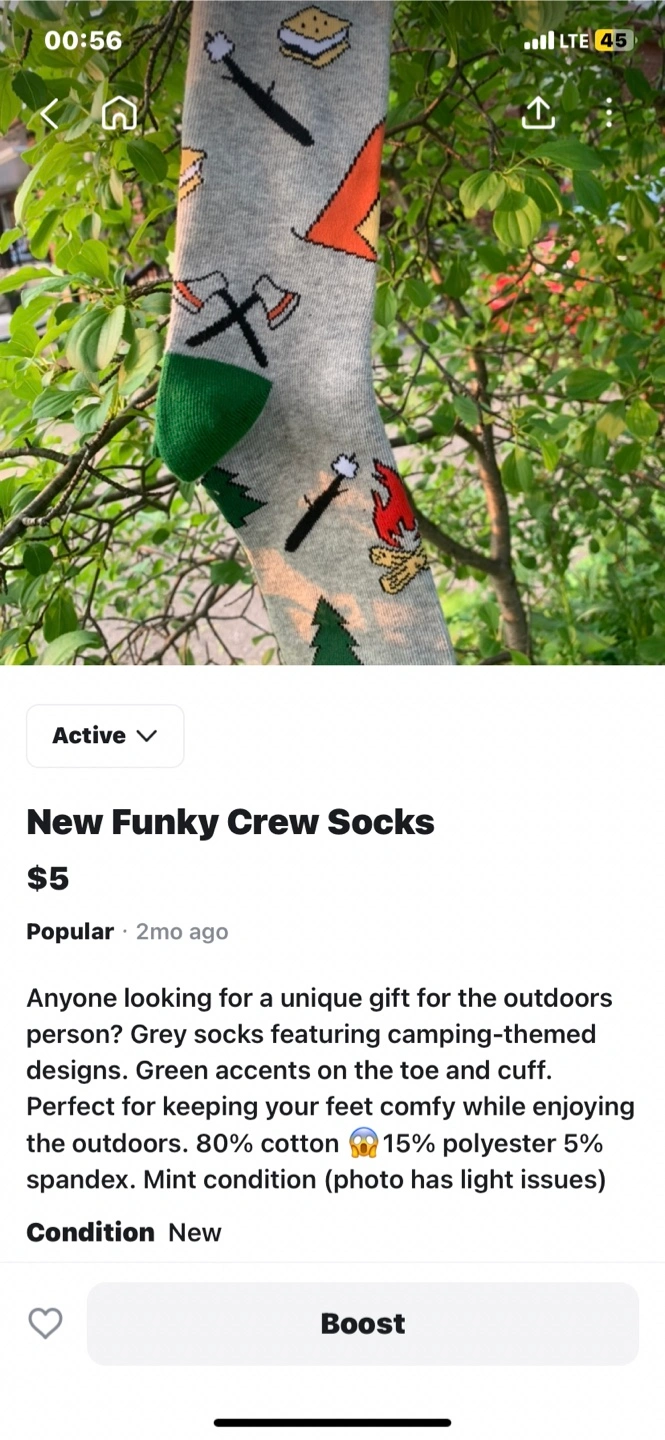 These are a brand new pair of Funky Crew socks! They're grey and feature a cute camping theme, with green accents on the toe and cuff. Perfect for keeping your feet comfy while enjoying the outdoors. They're made of 80% cotton, 15% polyester, and 5% spandex