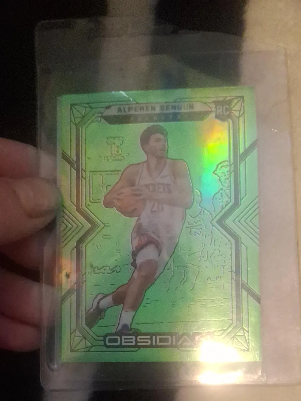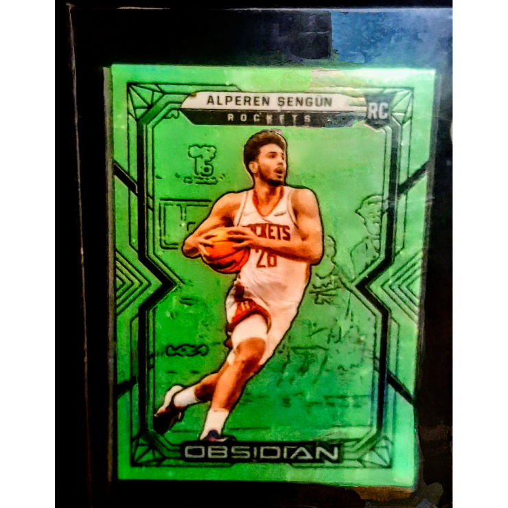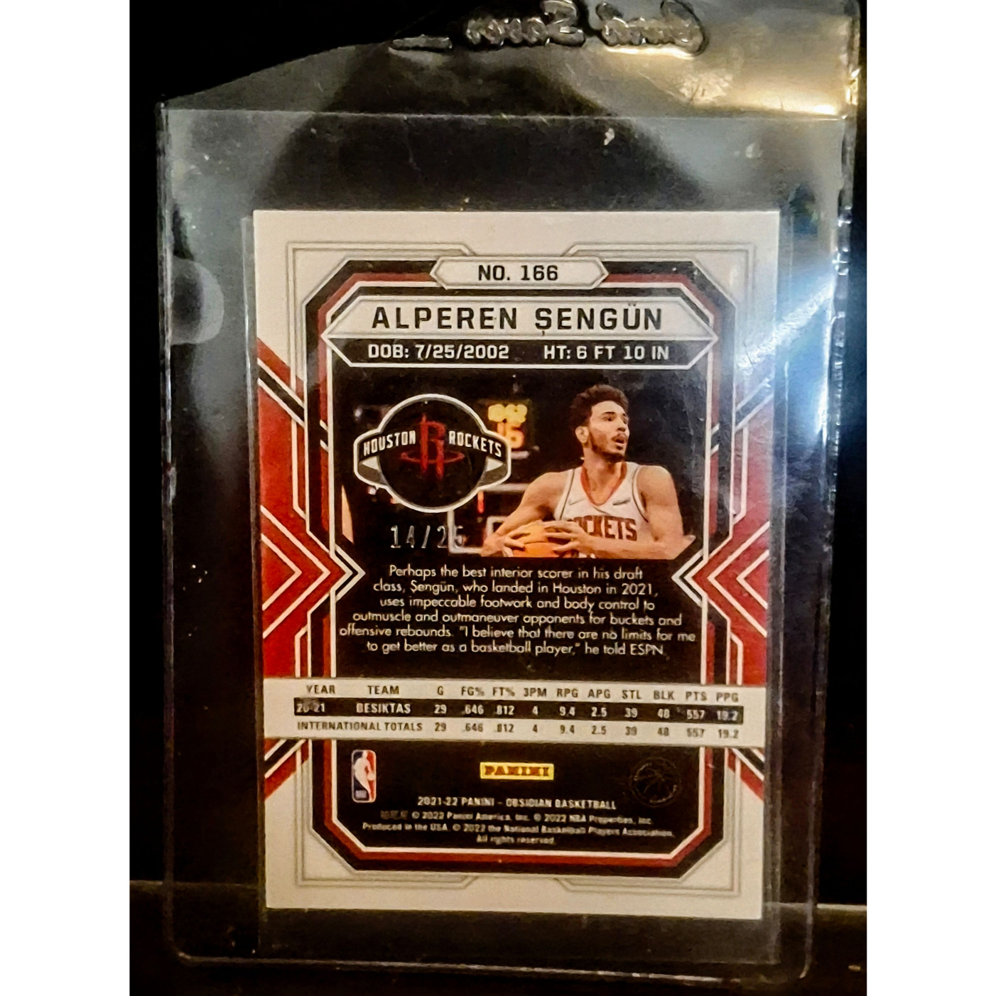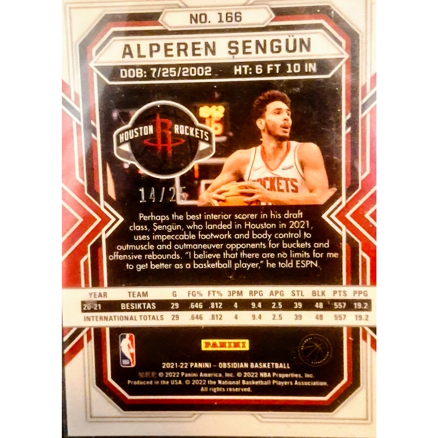 Genuine, & in Mint Conditioned 2021-22 Panini Obsidian basketball trading card featuring the Houston Rockets player Alperen Sengun #166 (RC) Rookie in the rare and Electric Green Flood colored background.