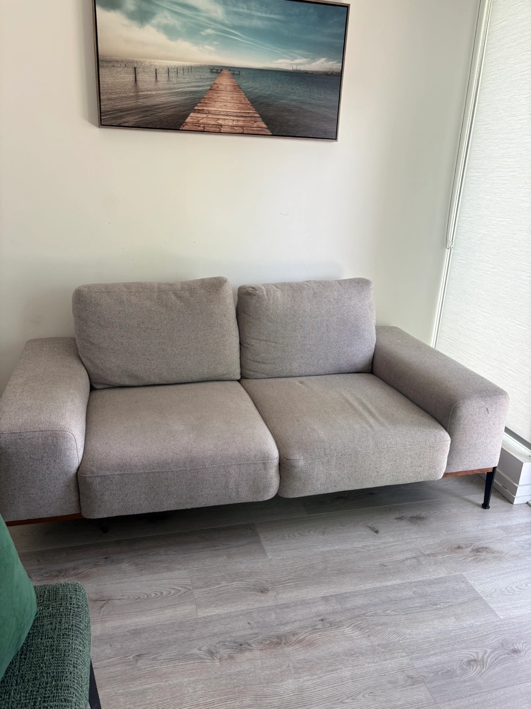 MOVING OUT SALE - Selling a comfy two-seater sofa in a neutral beige colour. It's in great shape and would be perfect for a small space or apartment. The cushions are soft and supportive, making it a great spot to relax after a long day. Ready for a new home!