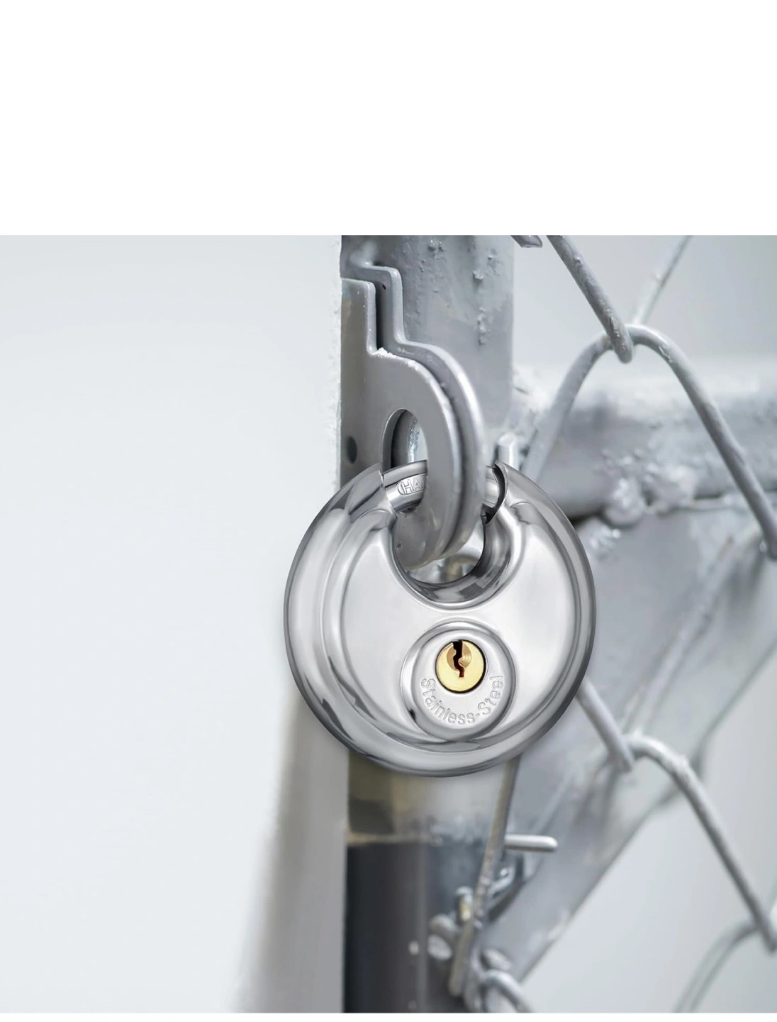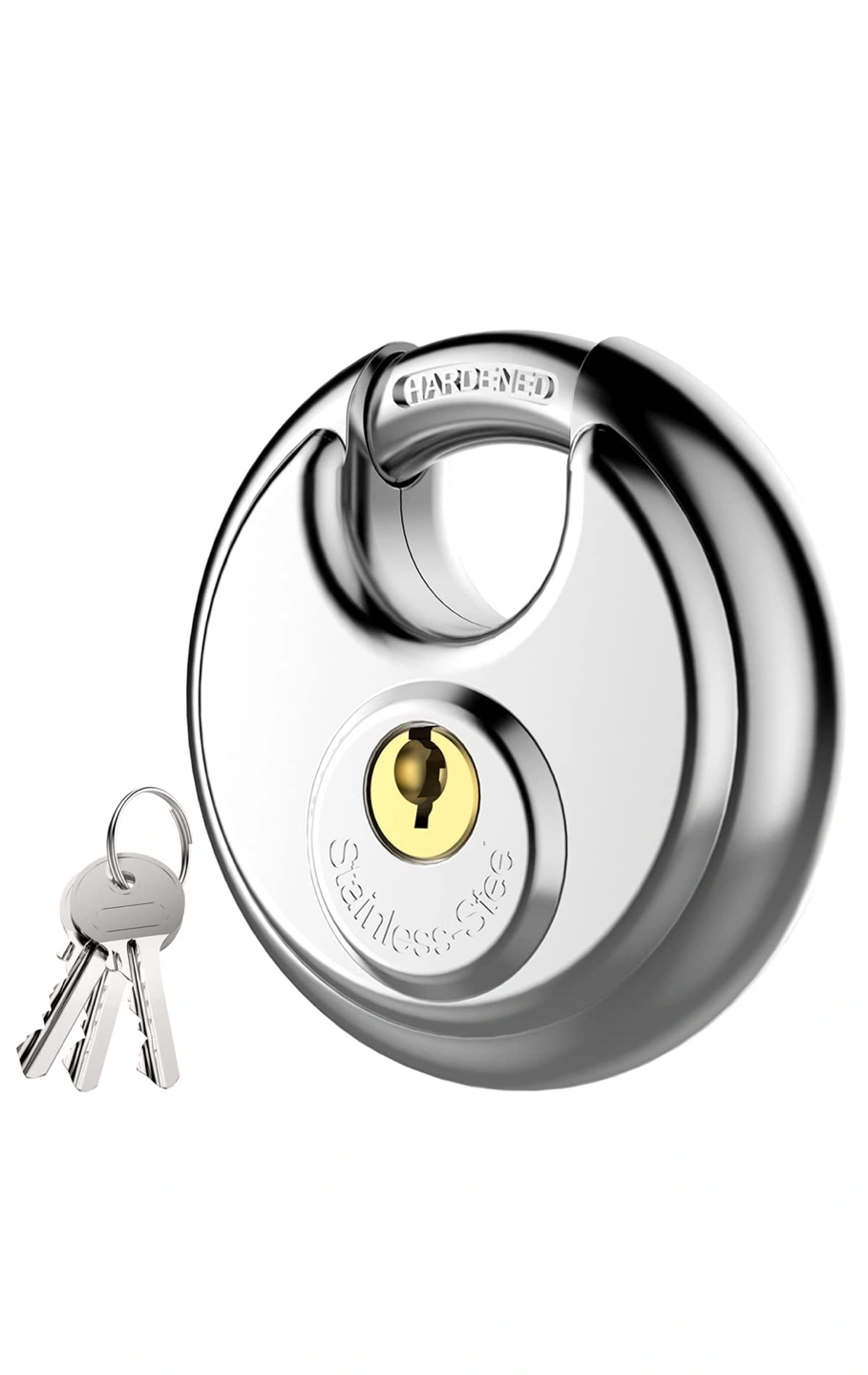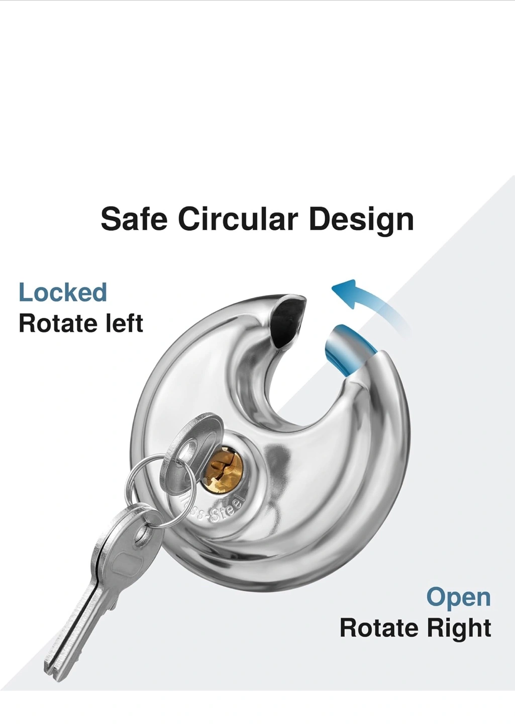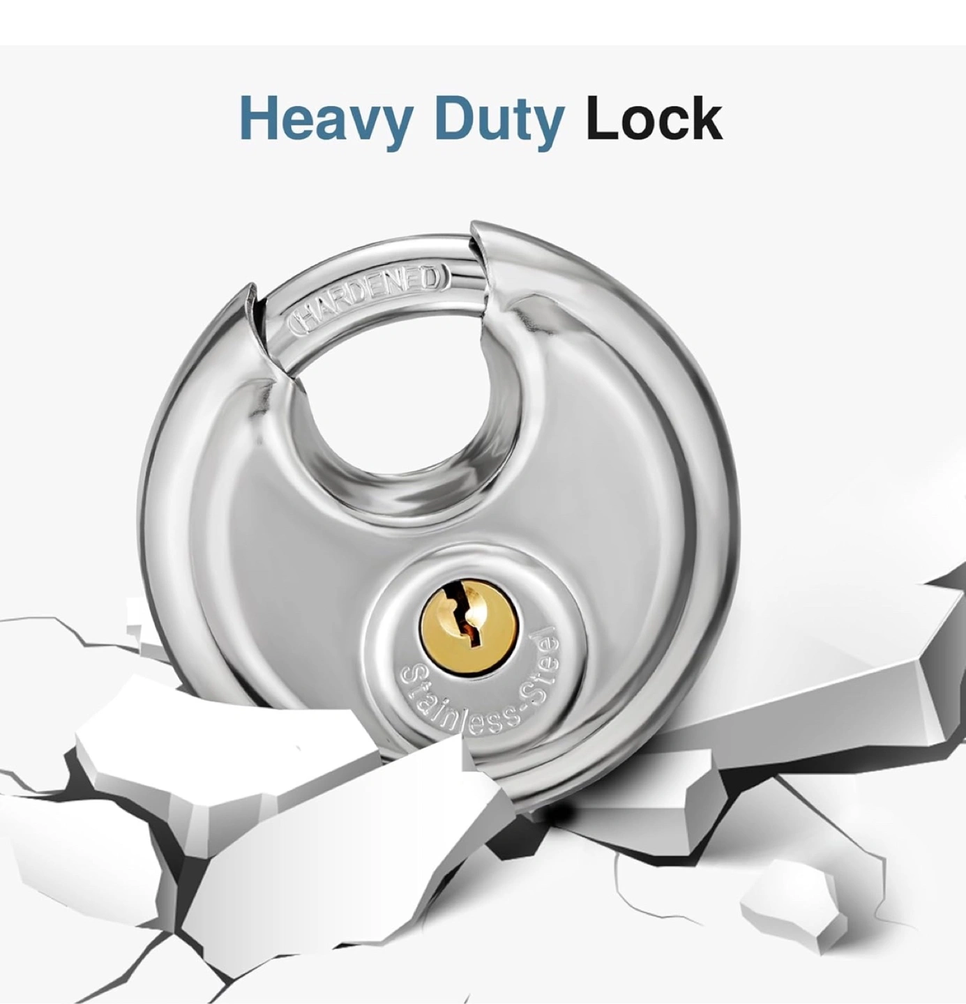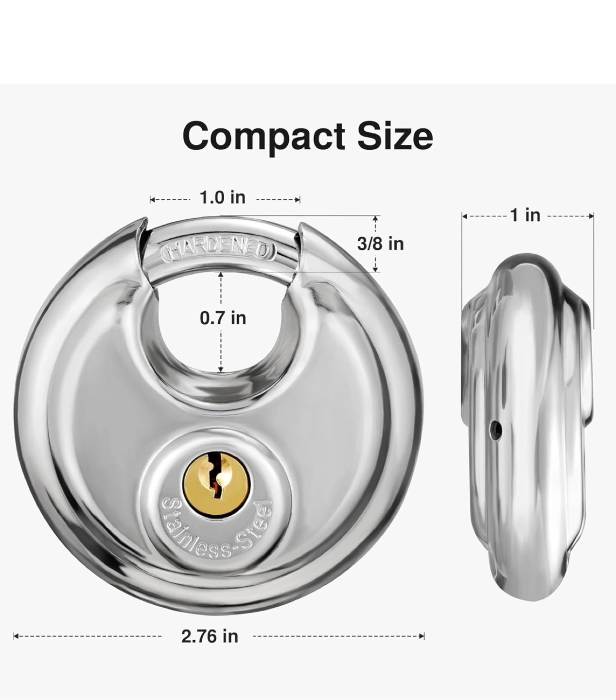 Selling a stainless steel disc padlock in great condition! It features a safe circular design and is made of hardened stainless steel. It's a heavy-duty lock with compact size: 1.0 in, 3/8 in, 0.7 in, 2.76 in
