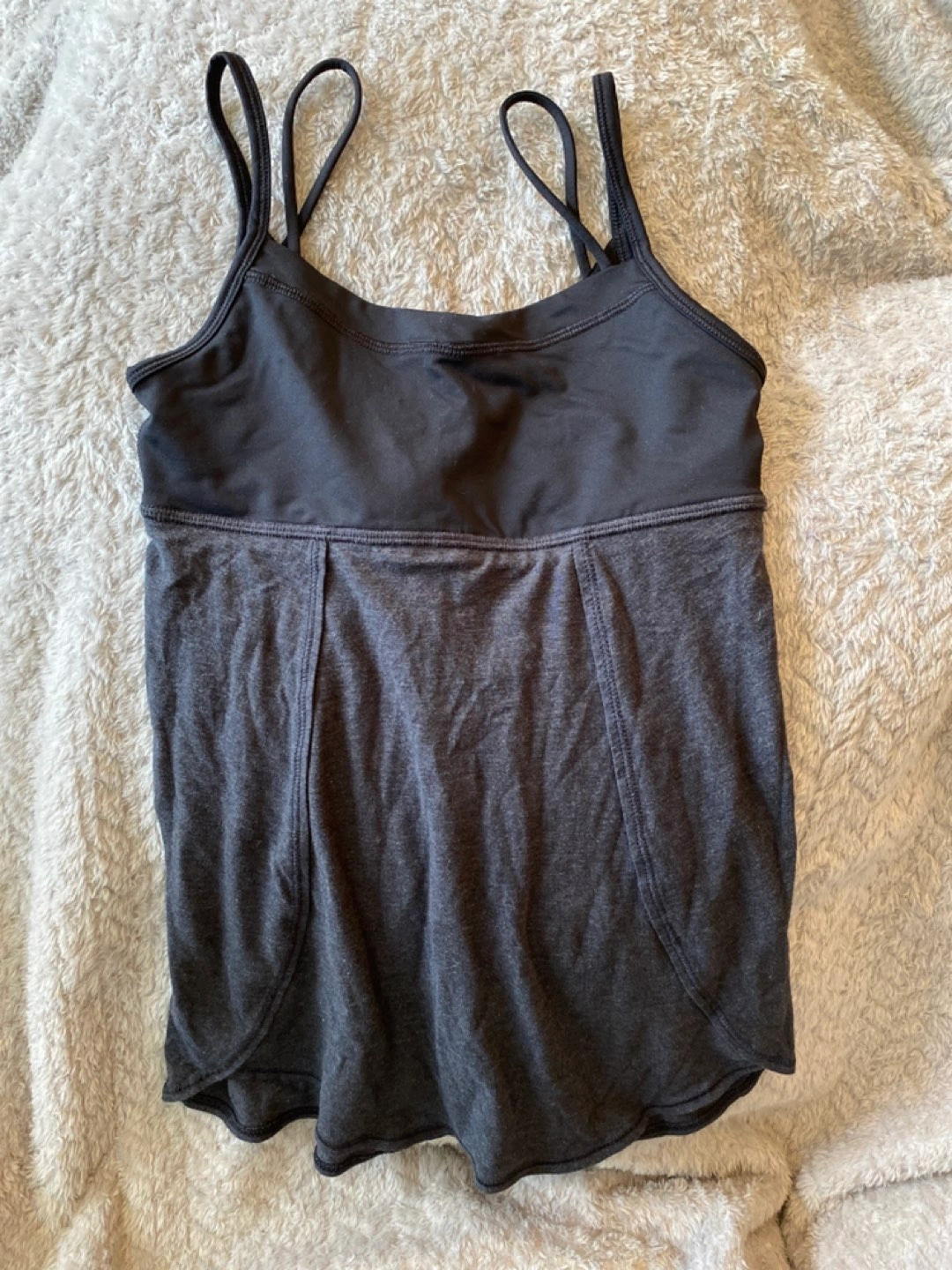 Black and charcoal grey tank top is in new condition barely worn. It’s flares out at the bottom and so flattering. The grey and blue sports bra top is reversible. This is still in good condition. black tank $20 Grey/Blue top $15 Pick up available near Mt Pleasant Elementary School ( close to Fraser & East Broadway )