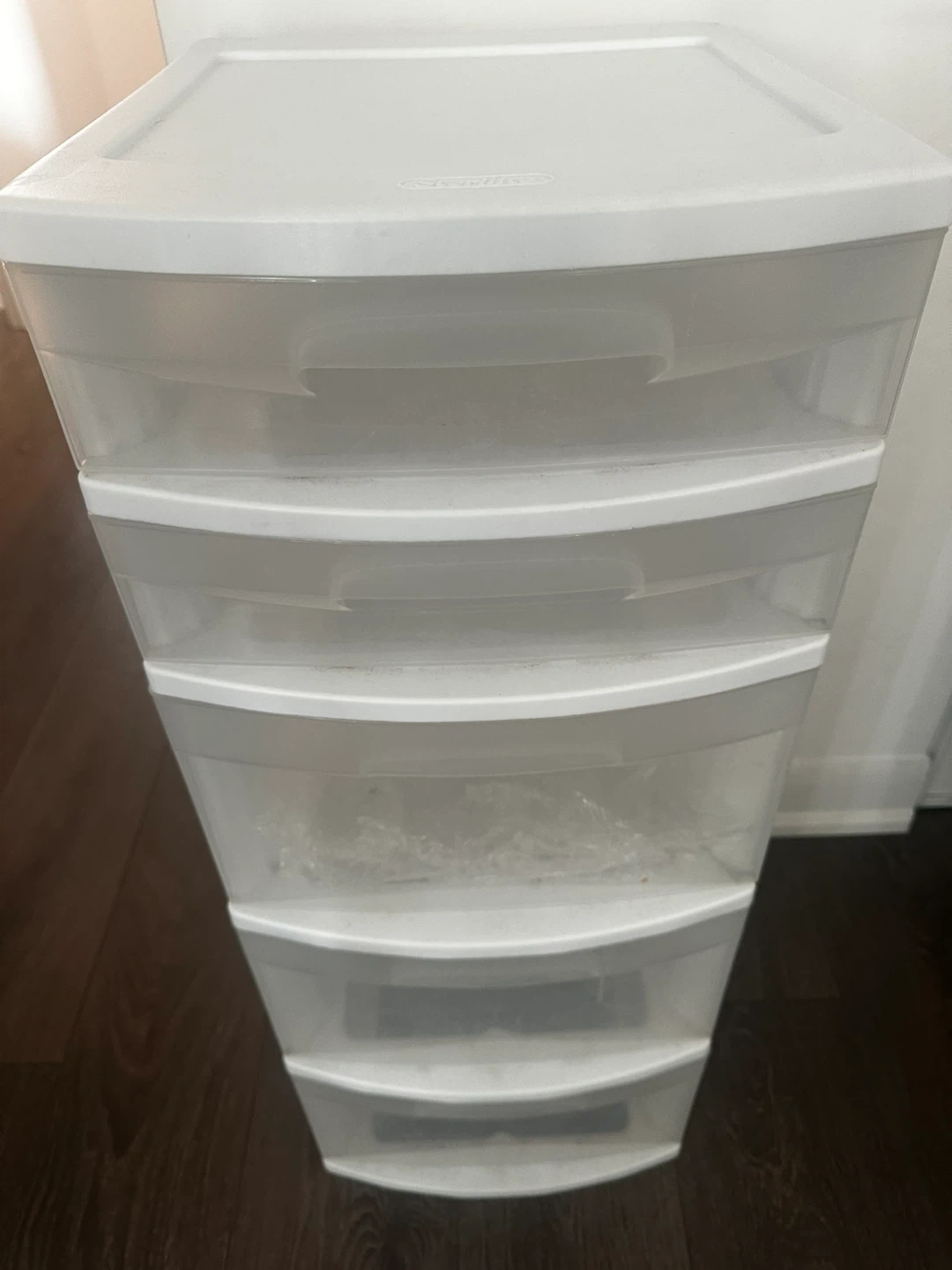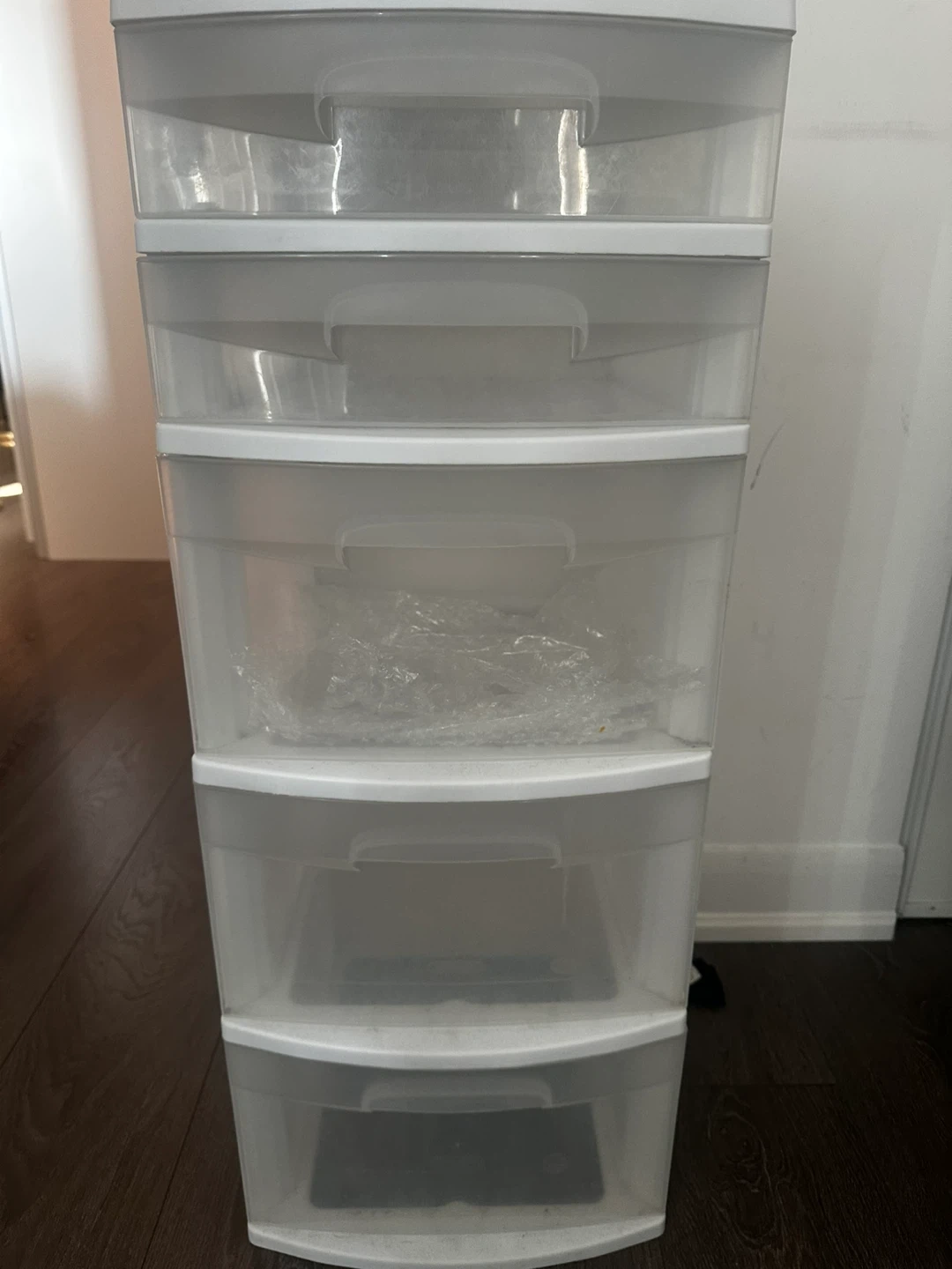 Selling a Sterilite 5-drawer tower! It's great for organizing and storing items. The drawers are clear so you can easily see what's inside. It's in good condition and ready for a new home