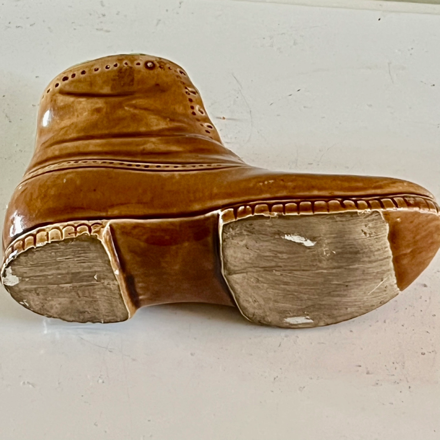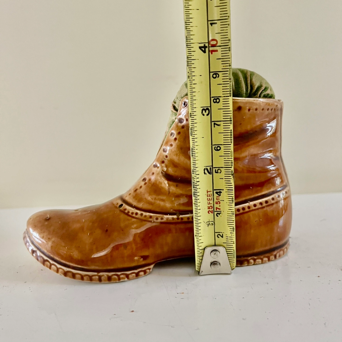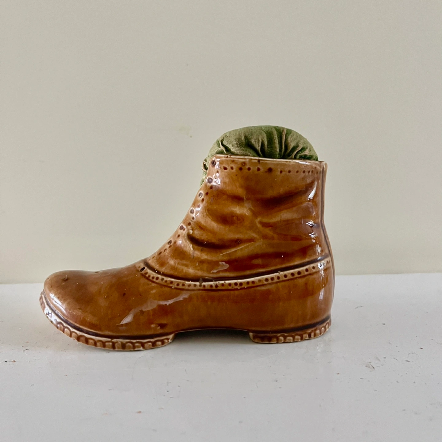This is a delightful late Victorian honey glazed pottery boot pin cushion, a charming and functional antique for any sewing enthusiast or collector. This unique piece features a beautifully detailed boot design with a honey glaze finish and a green velvet pin cushion insert. The boot is in good antique consdition.