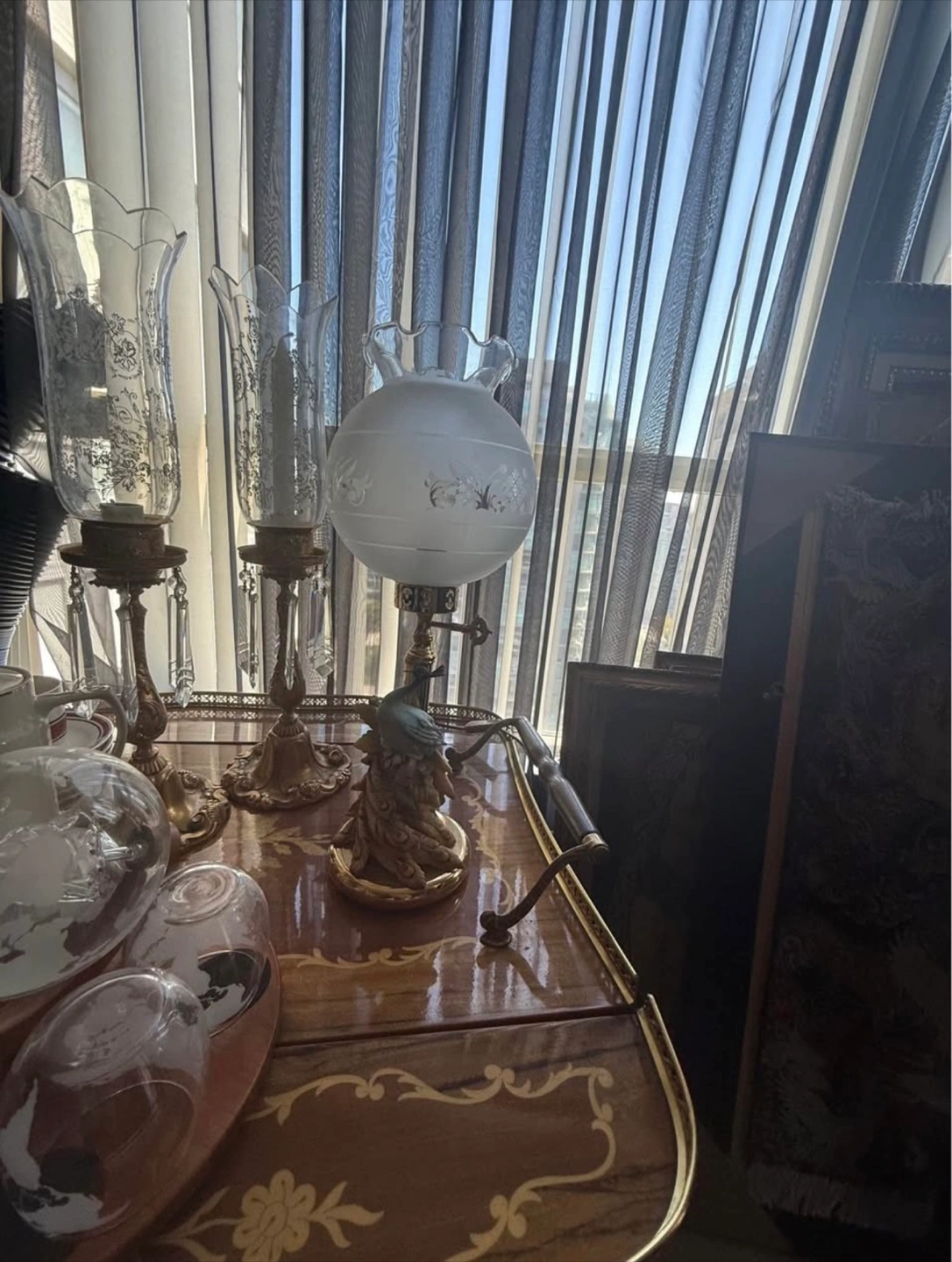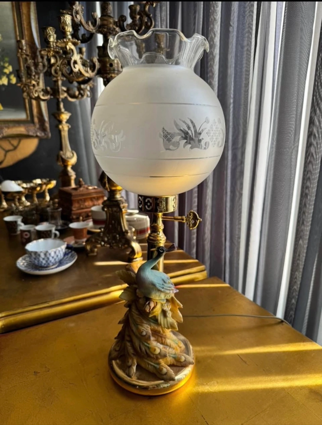 Decorative table lamp. Features a peacock base with a floral design. Includes a frosted glass lampshade. A perfect addition for a relaxing reading nook.
