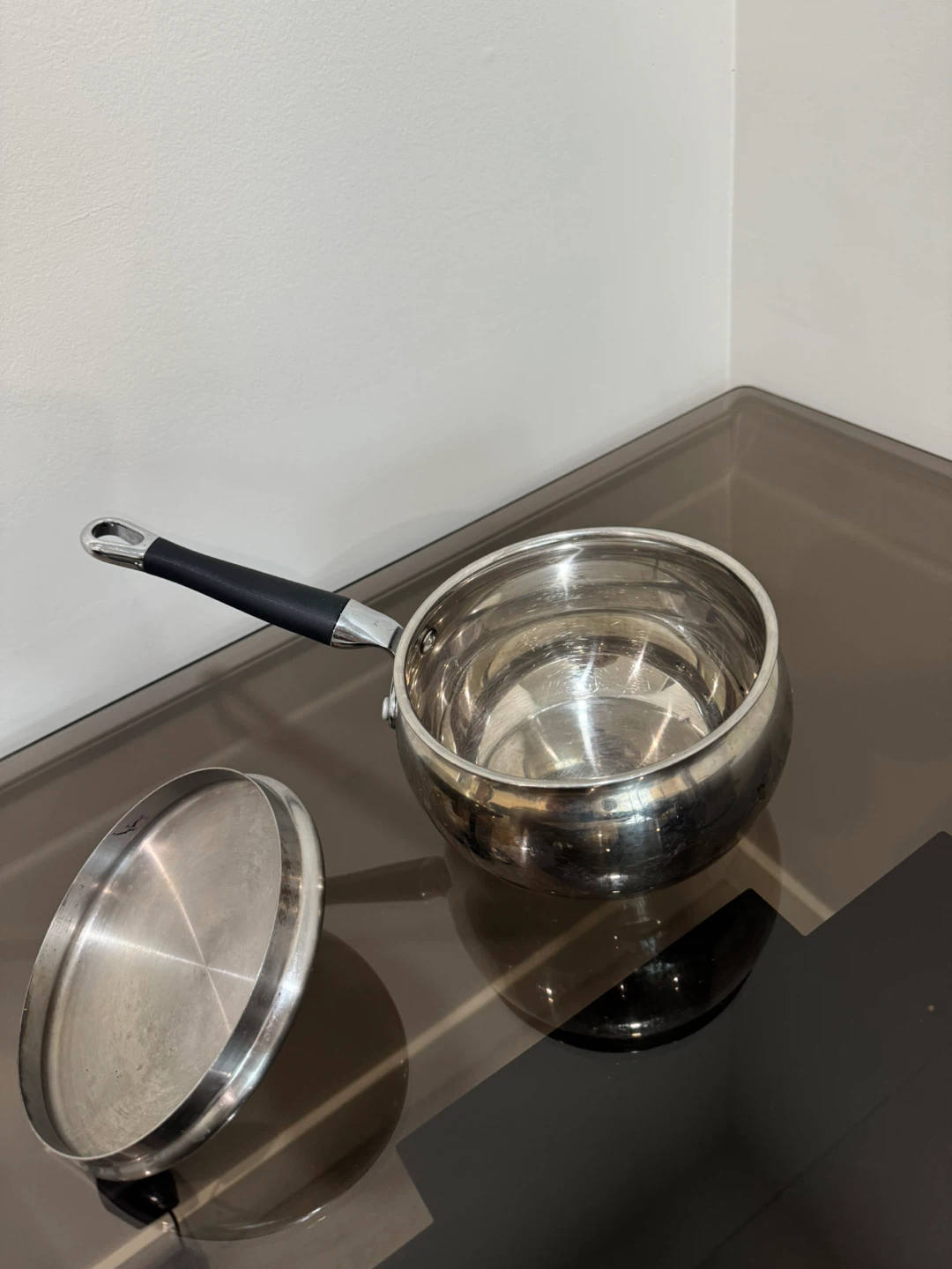 Selling a stainless steel saucepan with a lid. It's in great condition and ready for your cooking needs! The handle is black and easy to grip. Perfect for making sauces or heating up soup!