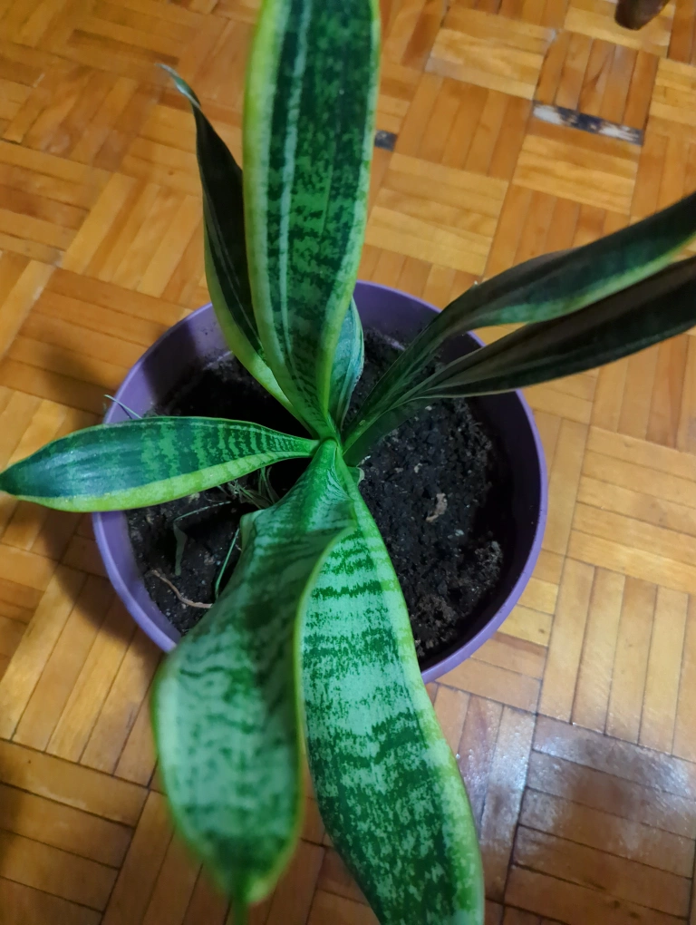 Selling a healthy sansevieria plant in a purple pot! It's a great low-maintenance houseplant that helps purify the air. The leaves have a lovely green and yellow pattern