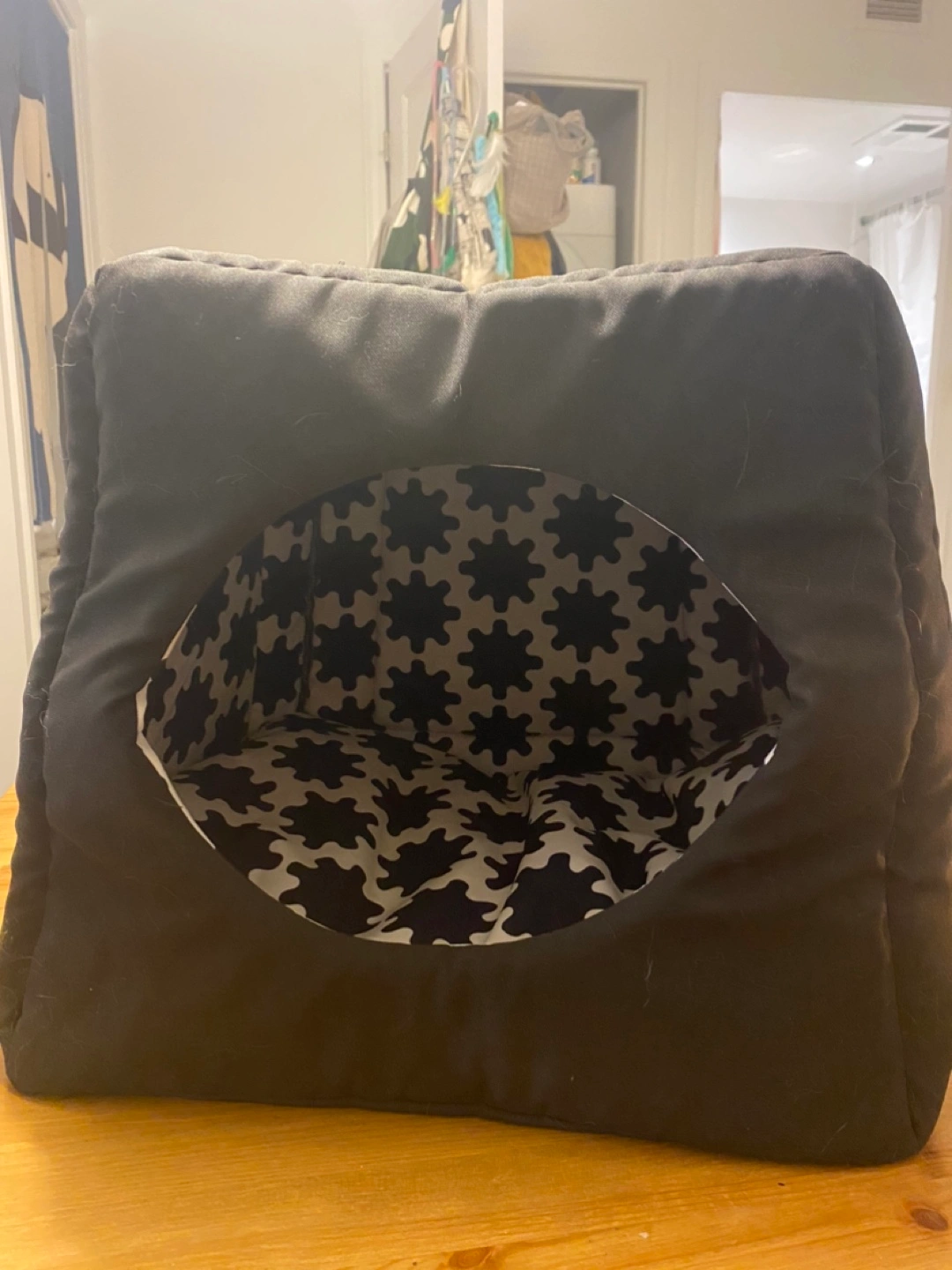 Selling a gently used IKEA cat house/bed! It's black with a fun patterned interior. Comes with a comfy cushion for your furry friend to relax on. Machine washable. It's in great condition and ready for a new home!