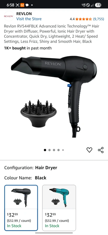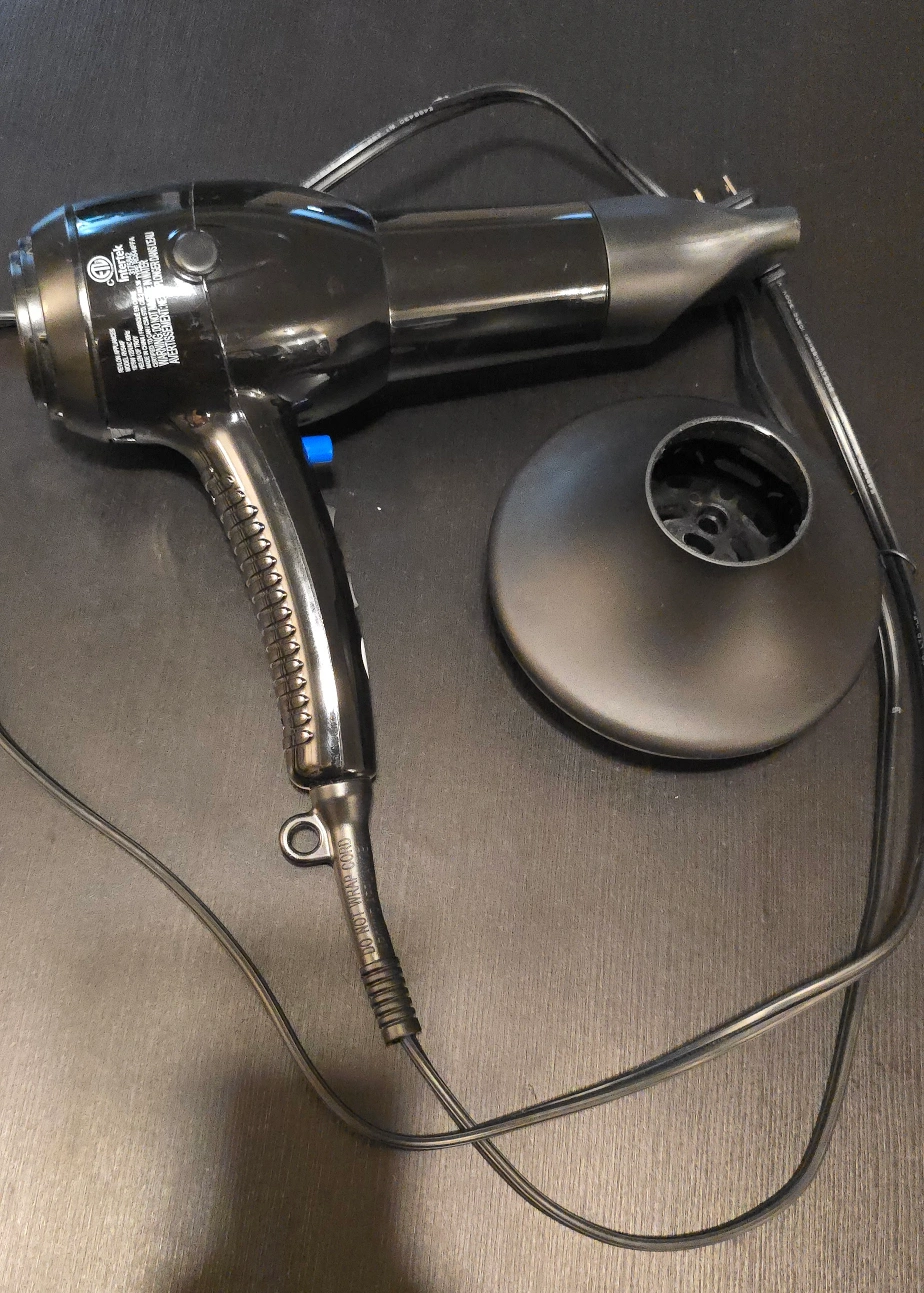 Selling a Revlon Advanced Ionic Technology™ Hair Dryer in black. It comes with a diffuser and concentrator. It has 2 heat/speed settings and a cold shot button.