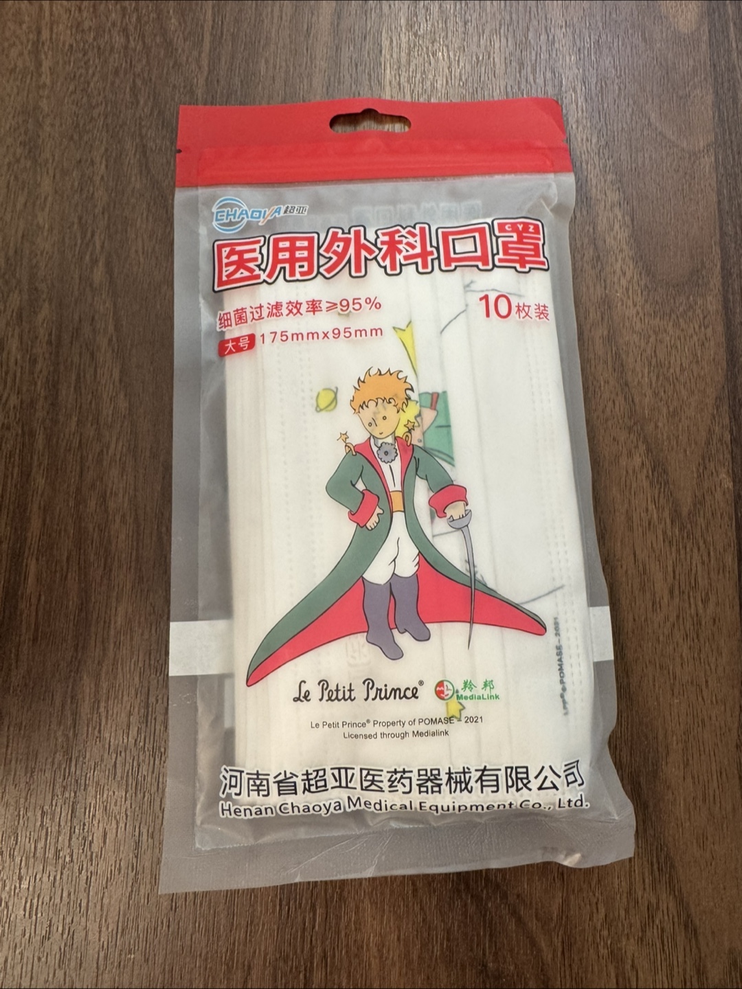 A pack of 10 surgical masks featuring Le Petit Prince! They're size 175mm x 95mm and have a bacterial filtration efficiency of ≥95%