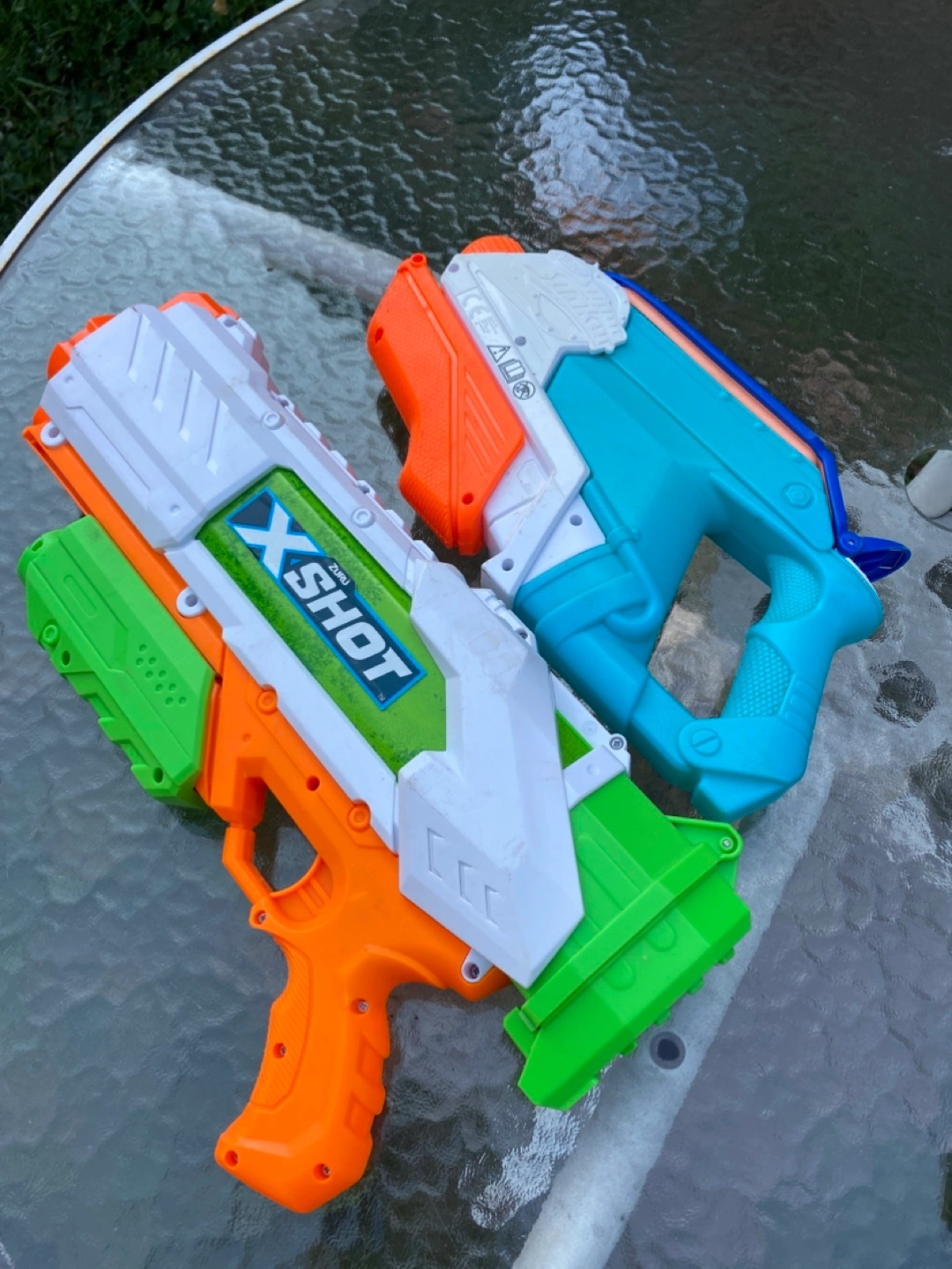 Selling a set of two Zuru X-Shot water guns! They're in great shape and ready for some summer fun. One is orange, green, and white, while the other is light blue, orange, and white. Perfect for kids and adults alike!