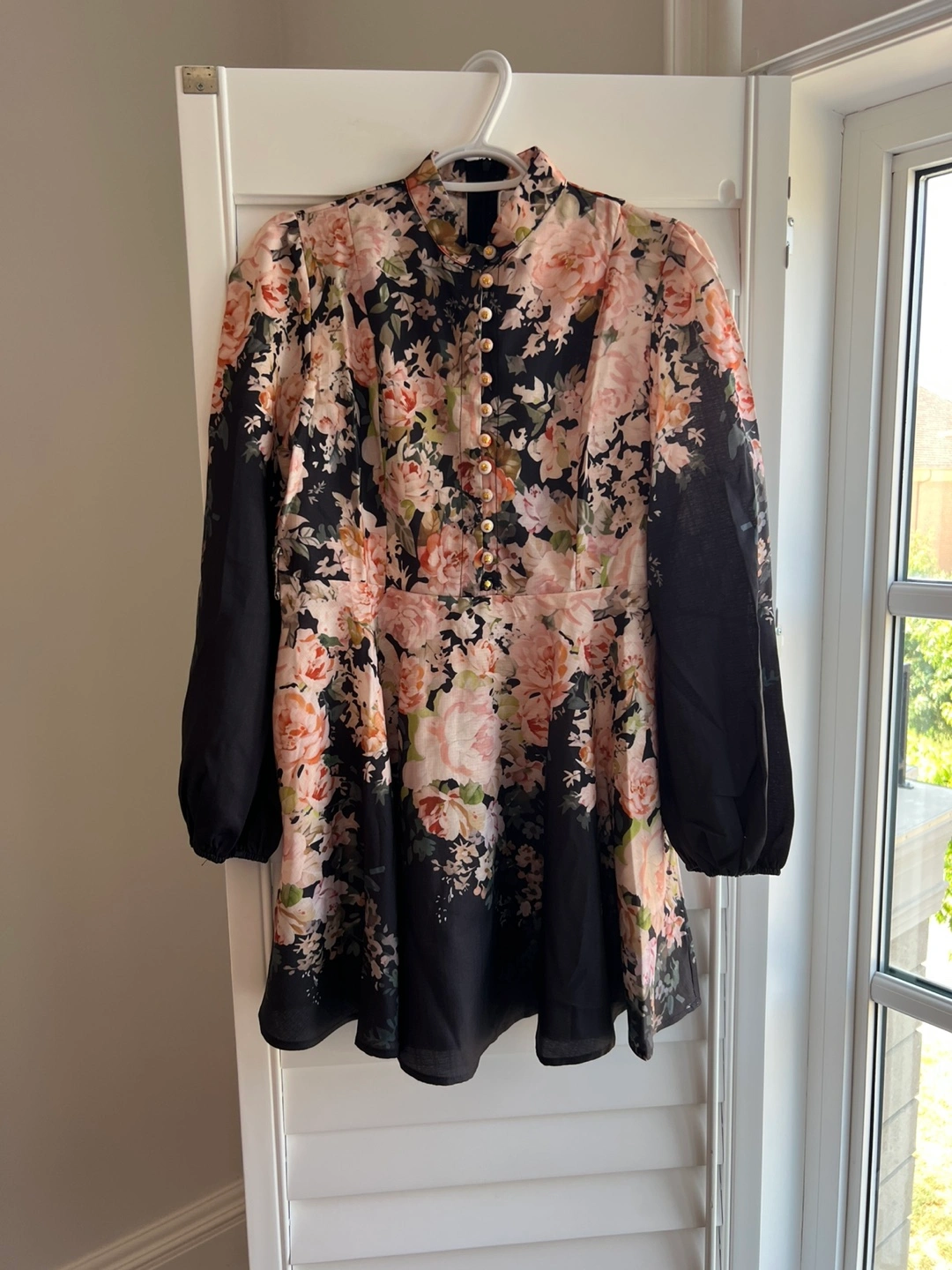 This is a lovely floral print mini dress with long sleeves. It features a high neckline with button details and a belted waist. The dress has a black and pink floral pattern.