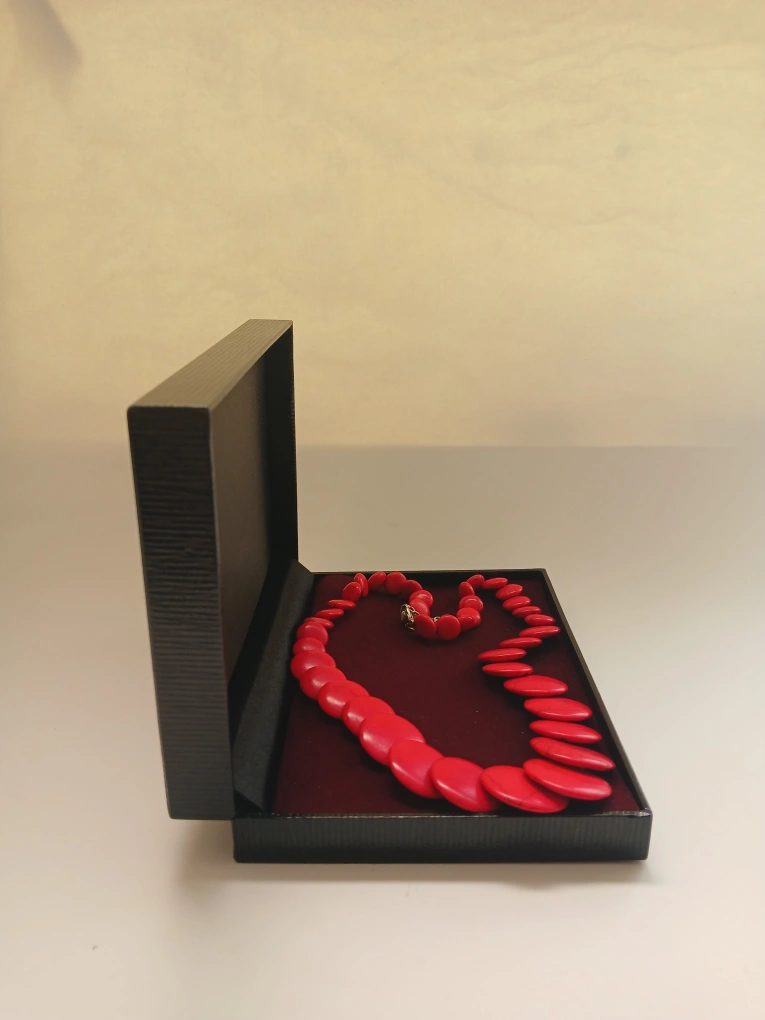 A striking red beaded necklace is up for grabs! It comes in a sleek black box, perfect for gifting or safekeeping. The necklace features smooth, rounded beads that create a bold and stylish statement piece