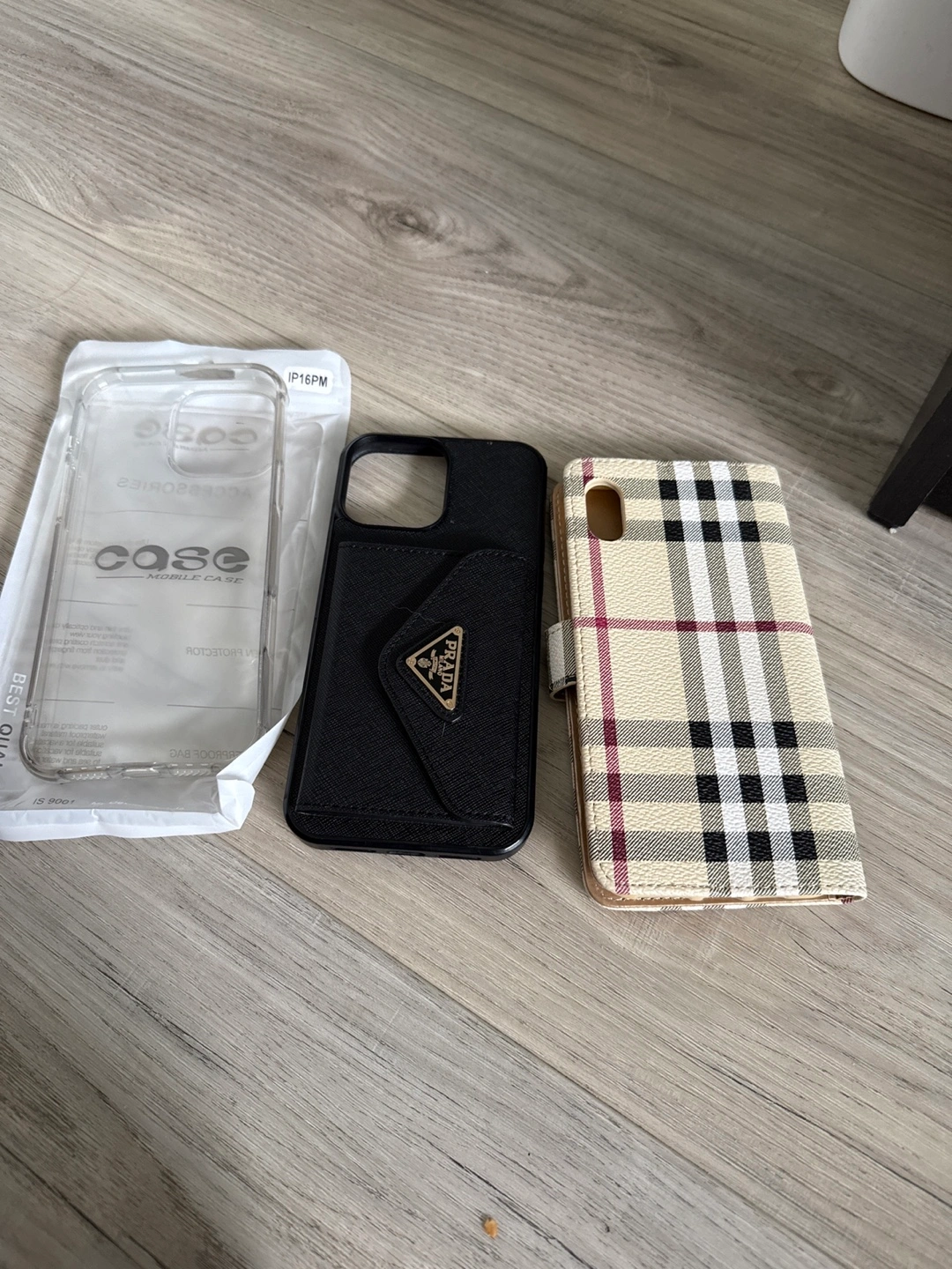 Selling a couple of phone cases for iPhone 14 Pro Max , iPhone 12 Pro Max One is a sleek black Prada case with a cardholder, and the other is a stylish Burberry plaid case. Also included is a clear case.