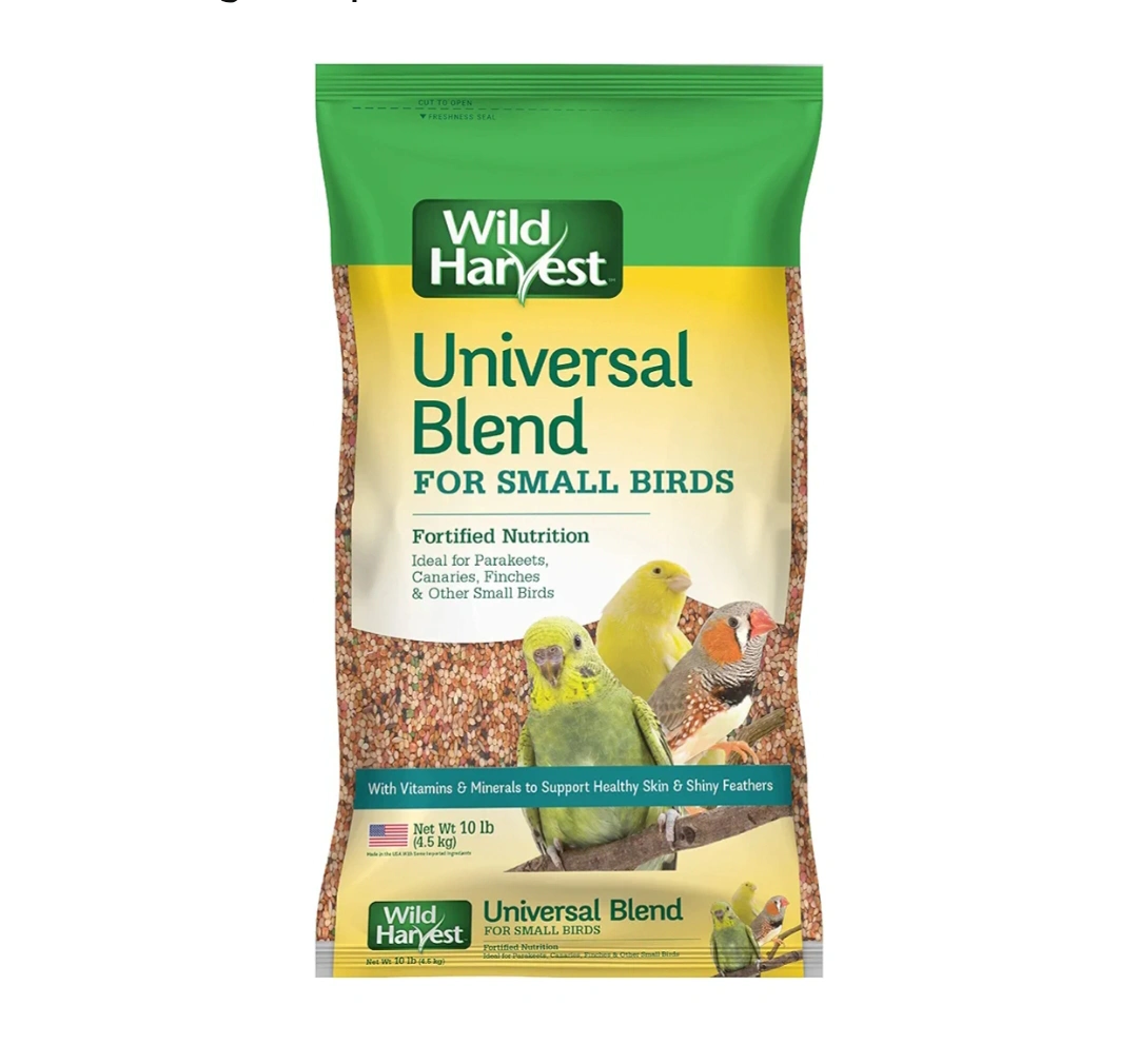 Selling a 10 lb bag of Wild Harvest Universal Blend for Small Birds. It's a fortified nutrition mix ideal for parakeets, canaries, finches, and other small birds. It contains vitamins and minerals to support healthy skin and shiny feathers. Fill seed cup daily with fresh seed and clean food dish before refilling, and always provide fresh drinking water during feeding