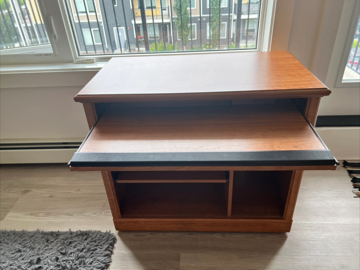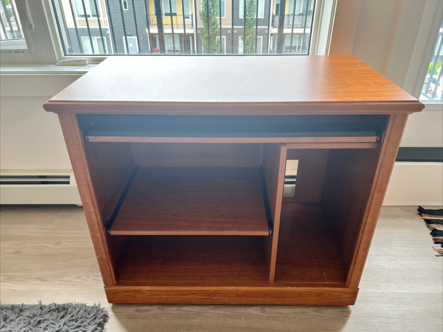 I'm selling a wood computer desk featuring a convenient pull-out keyboard tray. It's in great shape and ready for a new home office setup. The desk has a warm wood finish and provides ample space for your computer and accessories. It also includes a shelf for storage and has wheels.